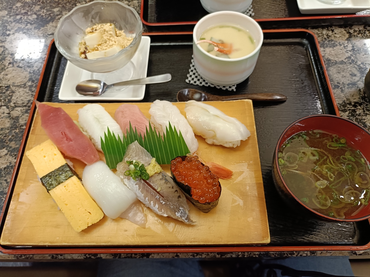 友人と平日ランチ、ずわい蟹の握りに惹かれましたが、お好みにせず、汁物、茶碗蒸し、デザート付き¥1870のランチセット食べてみました。お腹いっぱいで追加なく済みました。食後に食べた、きな粉、黒蜜掛けの牛乳ゼリーが美味でした。よく利用する友人は店舗によりなめこ汁のなめこの量に差があり、牛久はたっぷり◎、利用するなら7のつく日がポイント2倍でお得とか教えて貰いました。