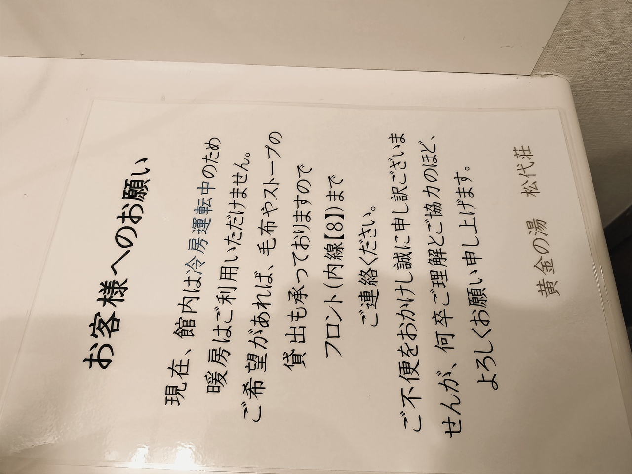 また、10月半ばの時期ですが、全館冷房中とのことで、寒い人は毛布やストーブの貸出をしているとの表示が部屋にありました。