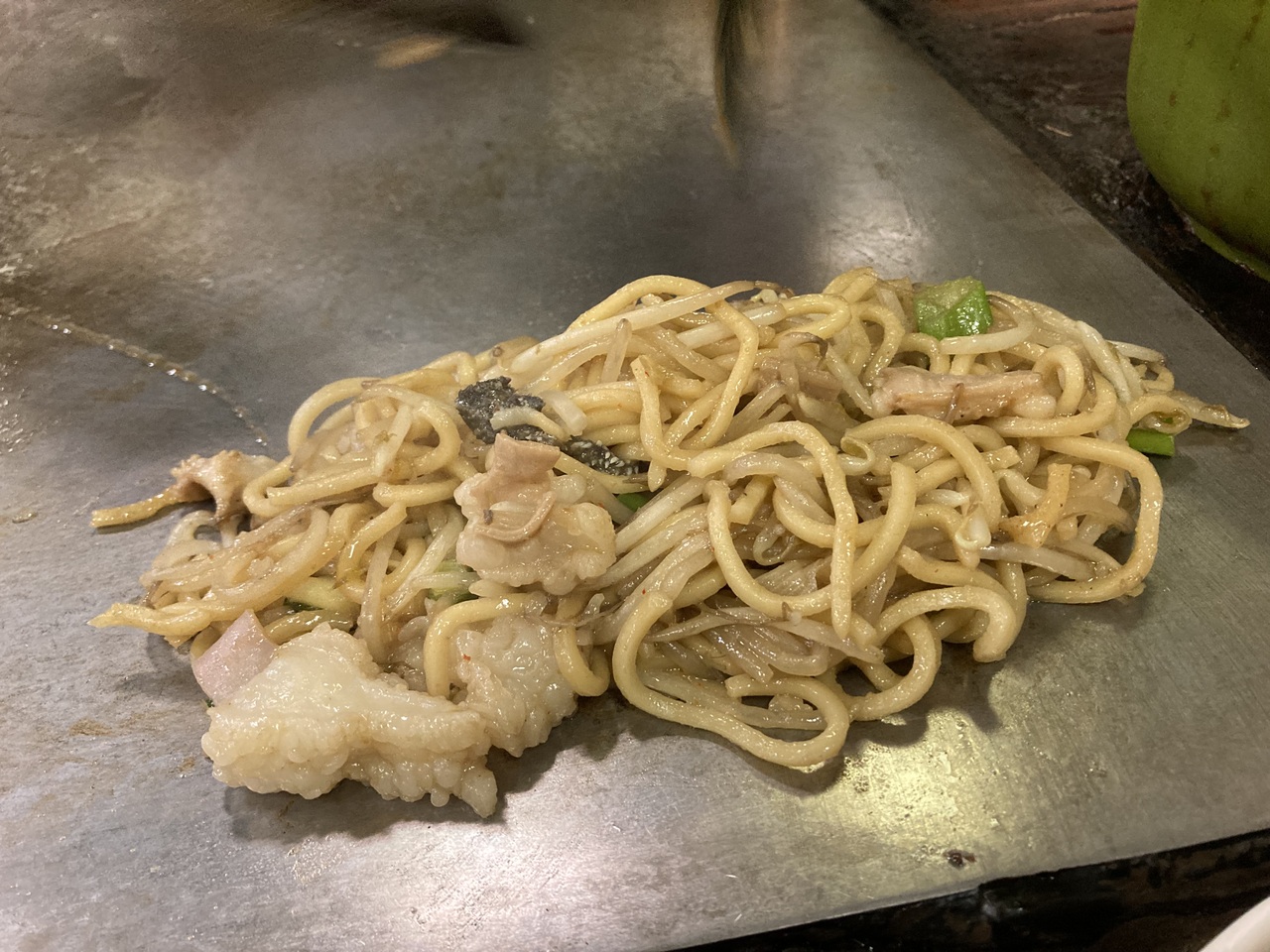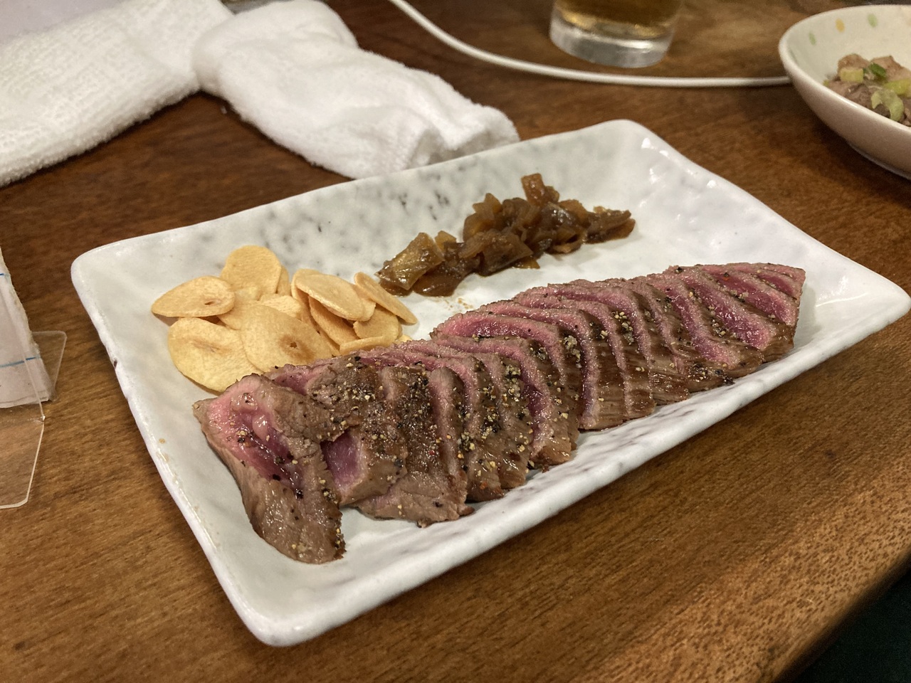人気グルメ番組の孤独のグルメに登場以降、鳥取で大人気のB級グルメ店です。その前までは地方都市にありがちな場末の飲食店だったらしい。場所は鳥取駅から歩いて15分くらい。予約は鳥取市内の固定電話番号でないとできないそうで、圧倒的に地元民が有利な状況のようだ。なので義姉に予約してもらい3人で入店しました。1席の空席もない満席状態に驚いた。従業員も無駄口たたかずひたすら調理に徹していました。オーカク、サイコロステーキ、ホルモンそばなどを頼みましたが、うま味調理料を使っているのでしょうね、全ておいしかった。会計時の頃には調理のピークを越えたようで、にこやかに応対していただきました。
