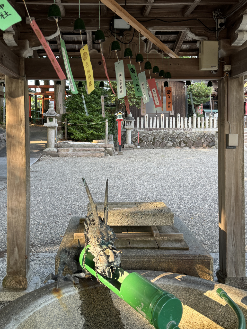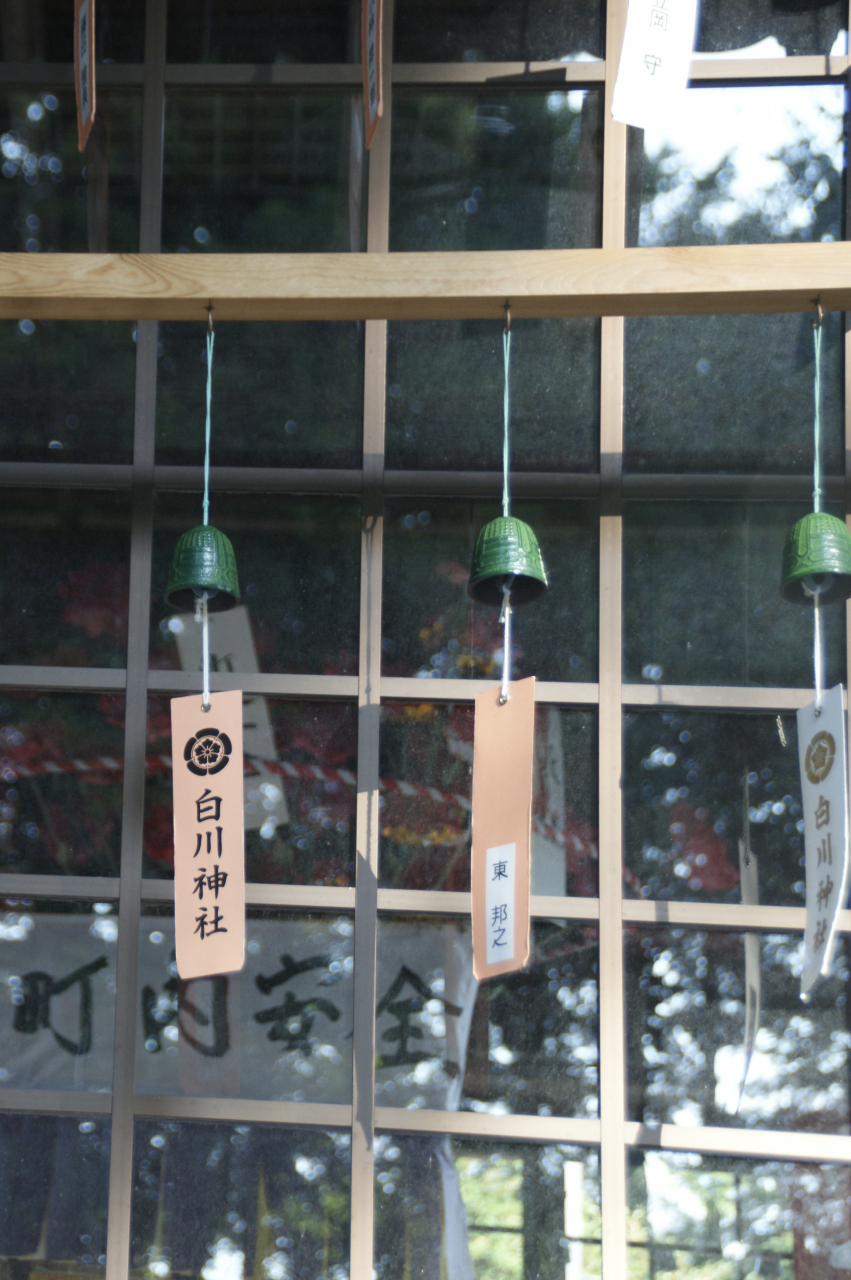 この夏甲賀エリアで〝夏詣〟キャンペーンの一環として〝風鈴まつり〟を市内施設で行うこととなった。白川神社もそのひとつではあるが、以前からも夏の時期には風鈴飾りを吊り下げられており、例年通り今年も行われていた。ガラス風鈴が用いられることの多い〝風鈴まつり〟のイベントの中で、白川神社では〝金属製風鈴〟が使われていた。ガラスに比べ低めの風鈴の音が、鬱蒼とした境内の中に奏でられている様子は、正に別世界と思われるようなものであった。多分年々そう大きく変わるものではないとは思うが、来年も訪れてみたいと思う魅力的な神社であった。