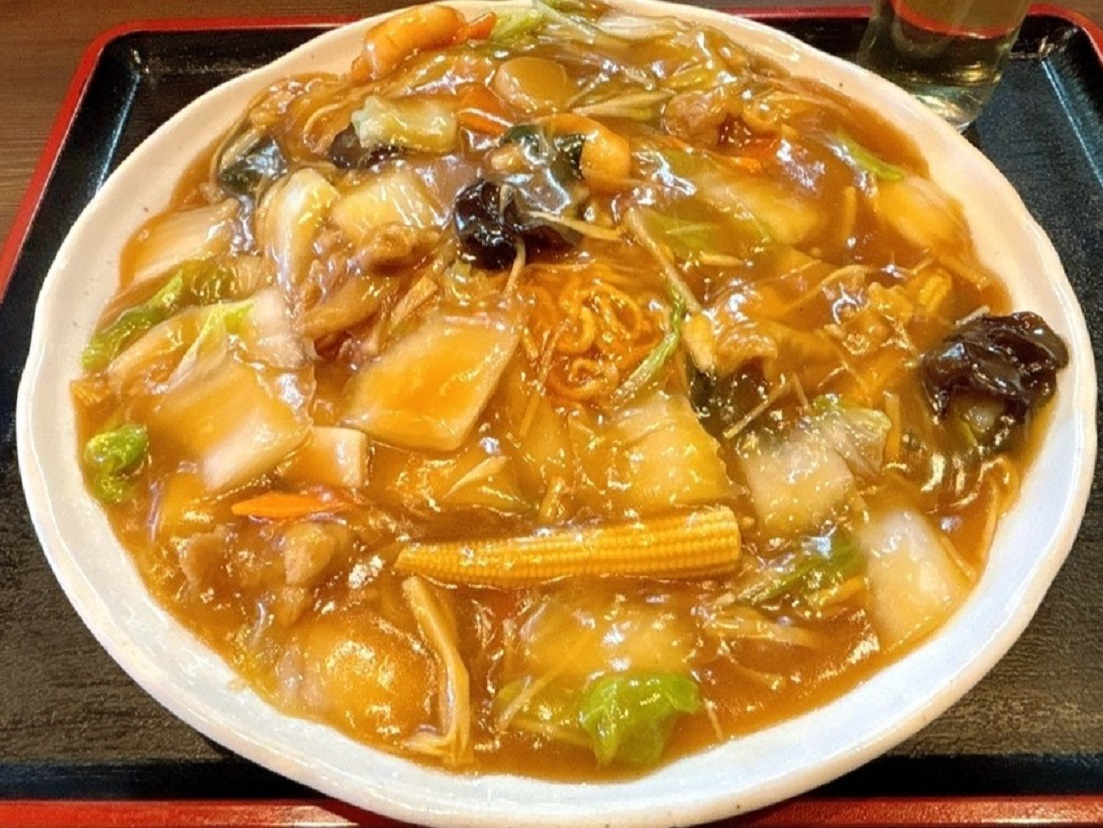 見るからにボリューム満点で、肉・海鮮・野菜でまとめられた餡かけのボリューム感が食欲をそそります!。がそれに反して味付けは至って普通で海鮮の味が弱くてインパクトに欠ける味でがっかりでしたが?…。序にお通しも味が今一でこれなら不要でした。