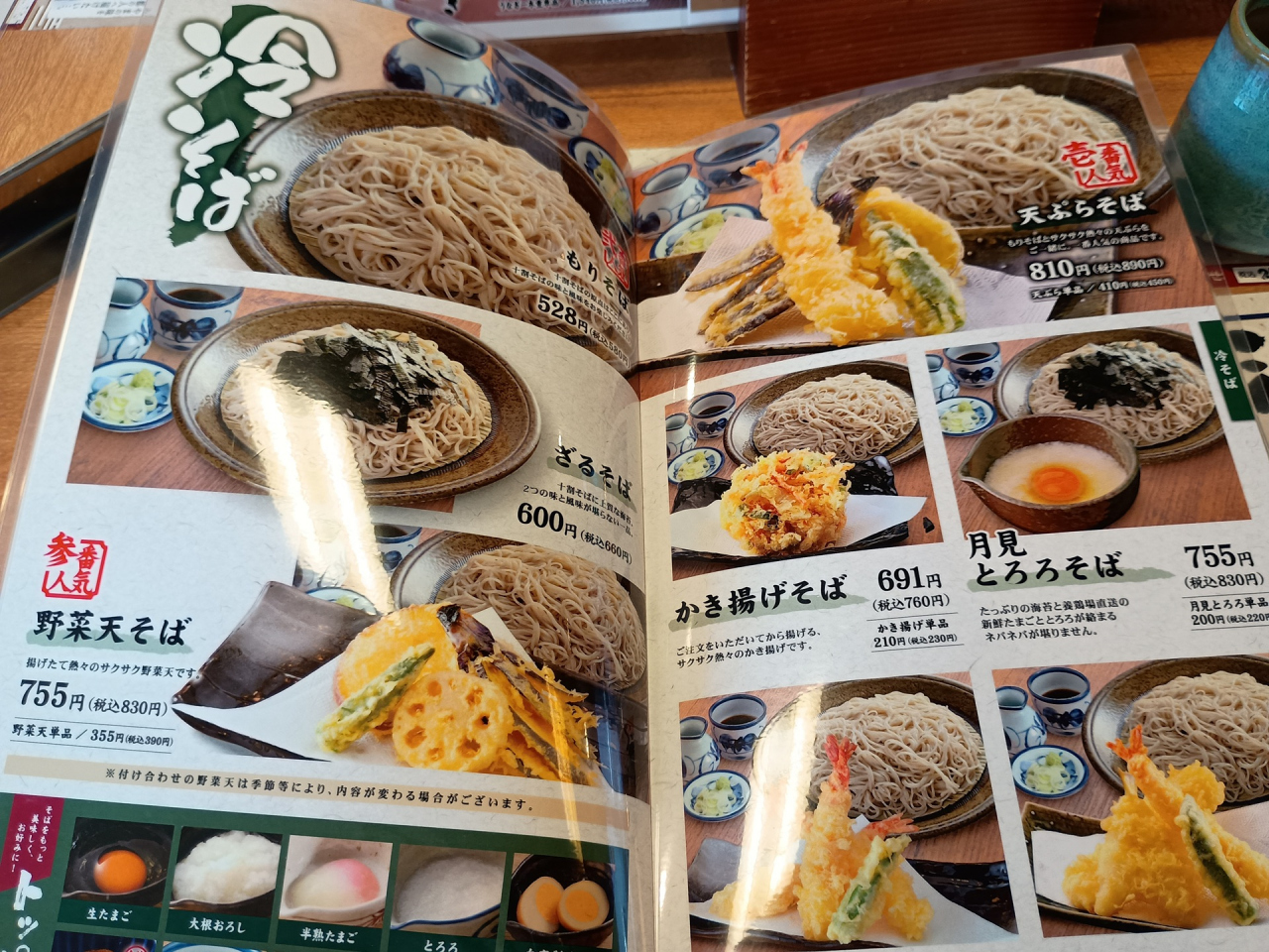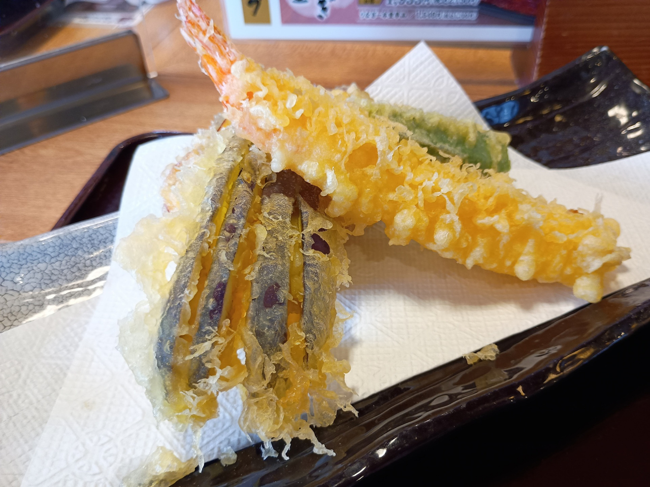 店内は広かったがほぼ満席。テーブル席中心なんだけど1人用のカウンター席もあるので安心。メニューを見るとリーズナブルな価格設定でどれにしようかと悩んでしまう。そしてオーダーしたのは「天ぷらそば」で大盛(無料)に。蕎麦は新そばで香りがあって美味しい。天ぷらも揚げたてで調理状態もかなり良かった。ただし蕎麦のつけ汁の他に天ぷら用のつけ汁が無かったのは残念だけど、塩の用意があったのでそれで美味しくいただいた。