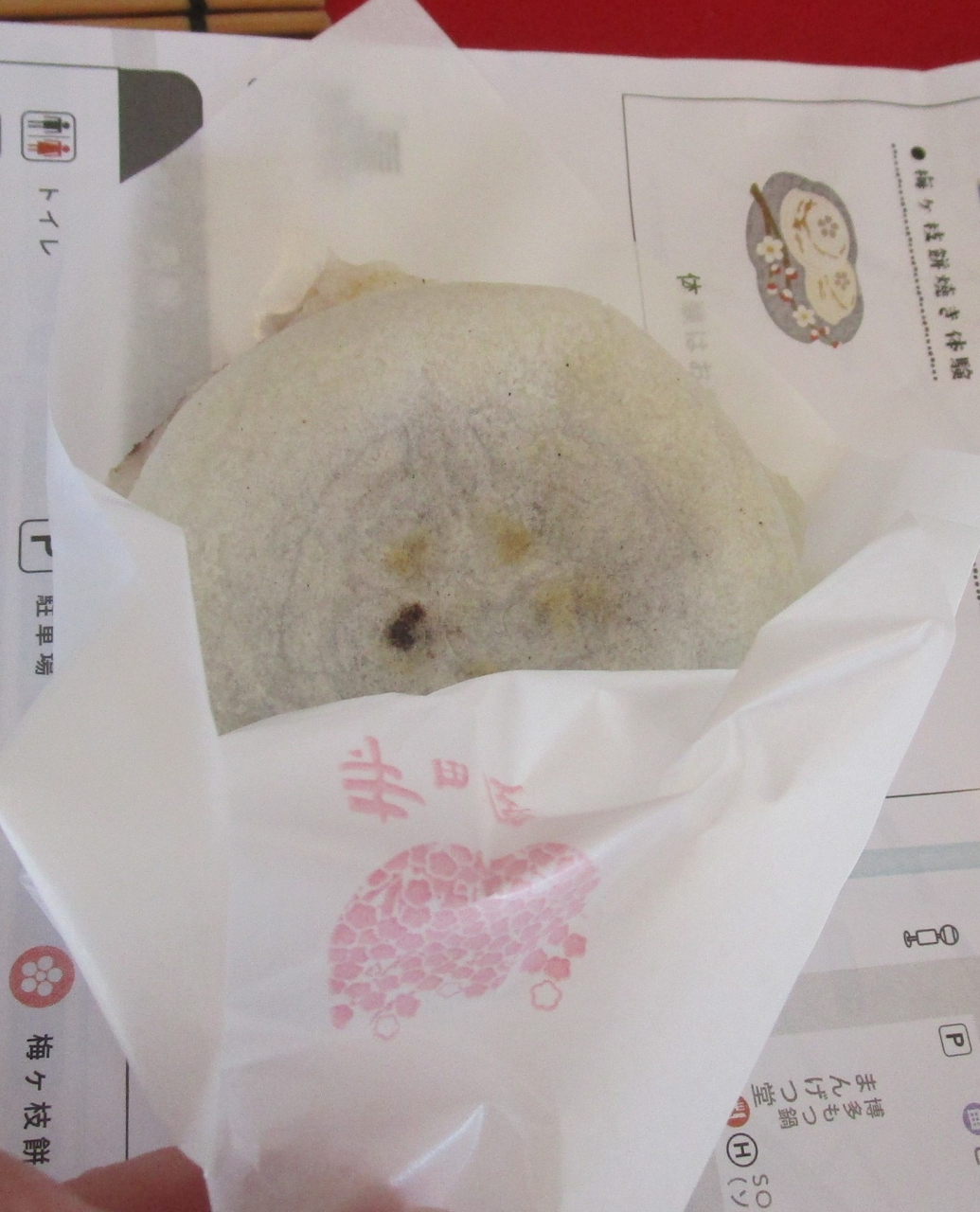 梅ヶ枝餅は、焼きたての表面はパリッと、中はモチッとした甘みを抑えた餡です。