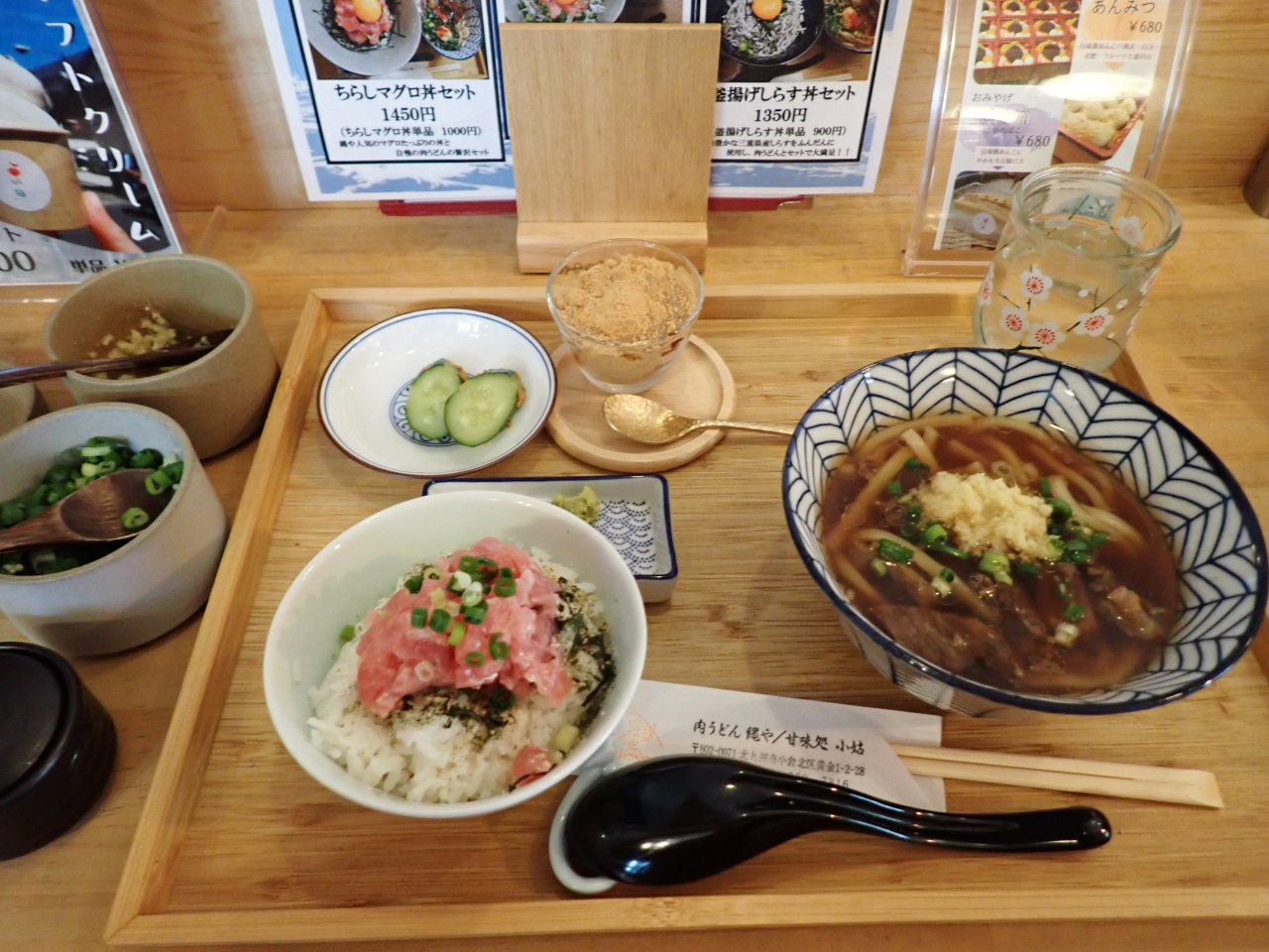 旅行直前偶然に、牛すじ肉のうどんが小倉あたりのローカルフードであることを知って、TOTOミュージアム訪問の折に訪問。ハーフサイズの、マグロ丼とわらび餅つきの定食をいただきましたが、初、肉うどん、美味しかったです。おろし生姜と小ねぎも自分好みの量で調節。おだしが色は濃いけどちょうどいい塩梅。