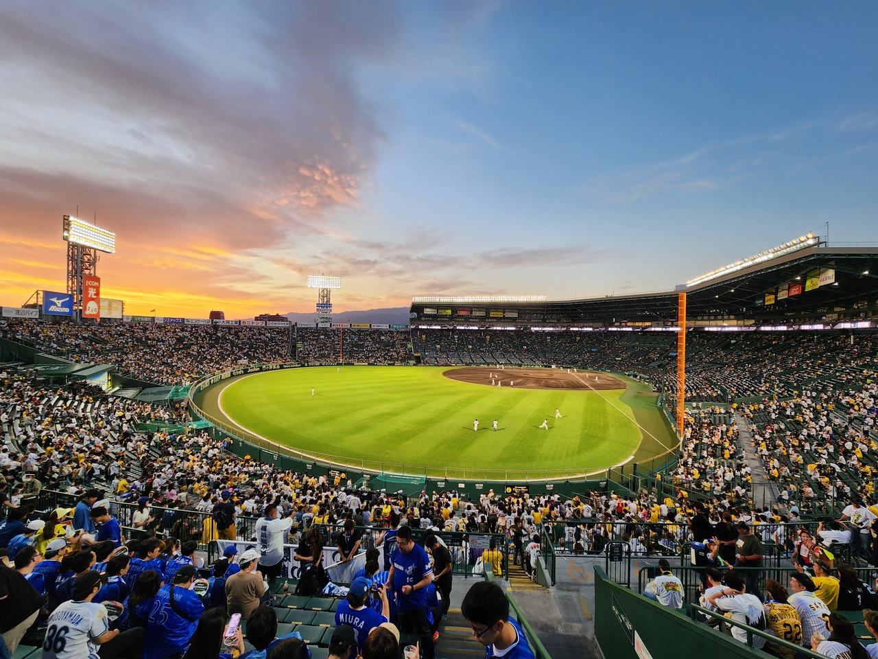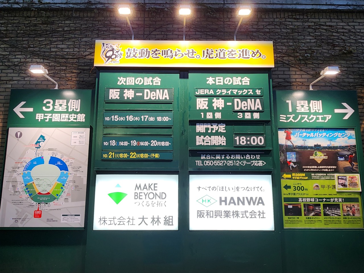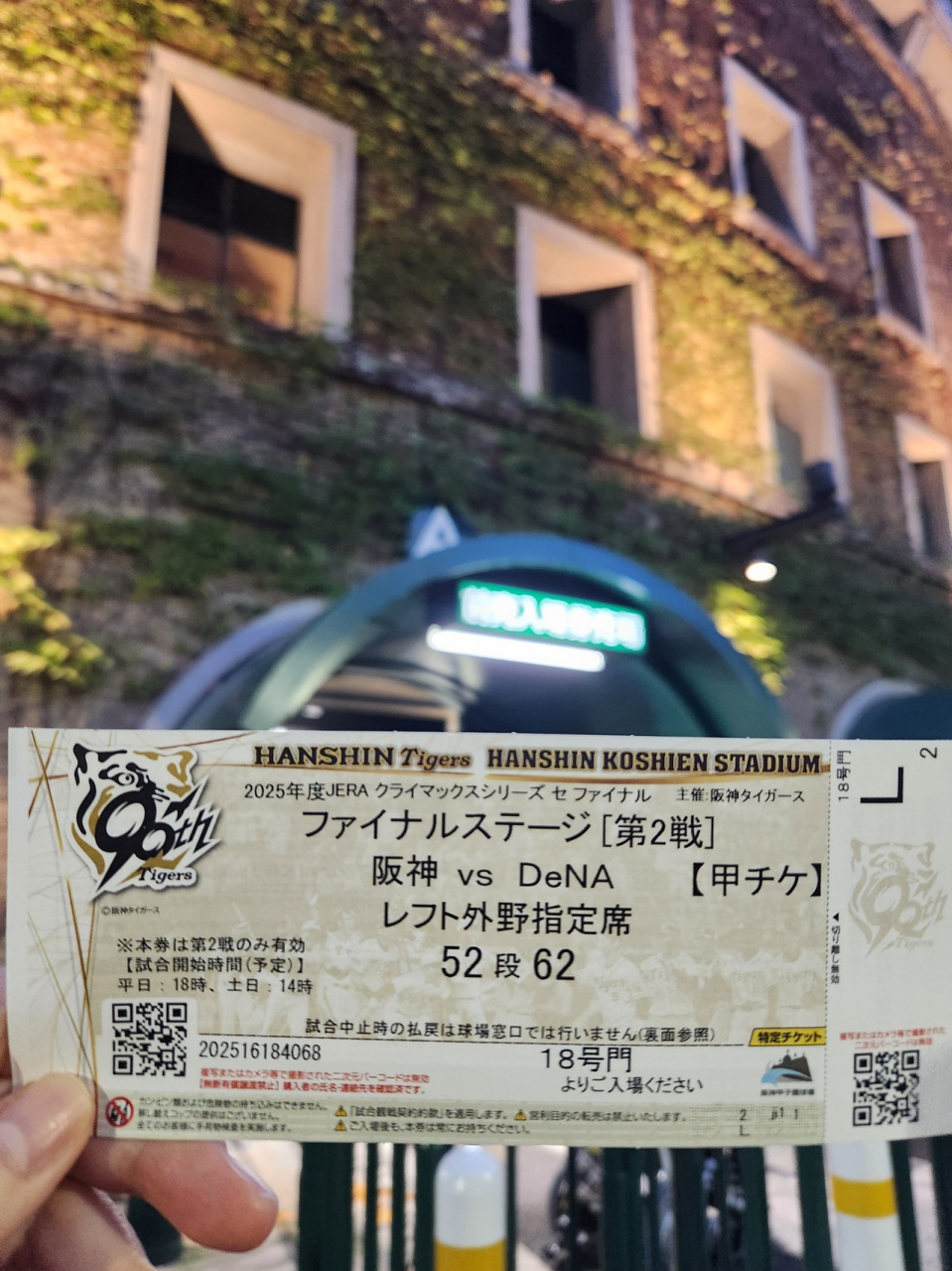 クライマックスシリーズファイナル第2と第3試合を観戦に行きました。大阪梅田から阪神電車で甲子園駅で降りるとすぐです。タイガースの本拠地なので、駅も吉野家も人も黄色多めです。45000人入る大きな球場、手入れされた緑の芝生と濃い茶色の土、夕焼けが映えて本当に美しい球場です。とはいえ、私にとっては超アウェイなので360°黄色に囲まれ、しんどかったです。結果は完敗。10月16.17日