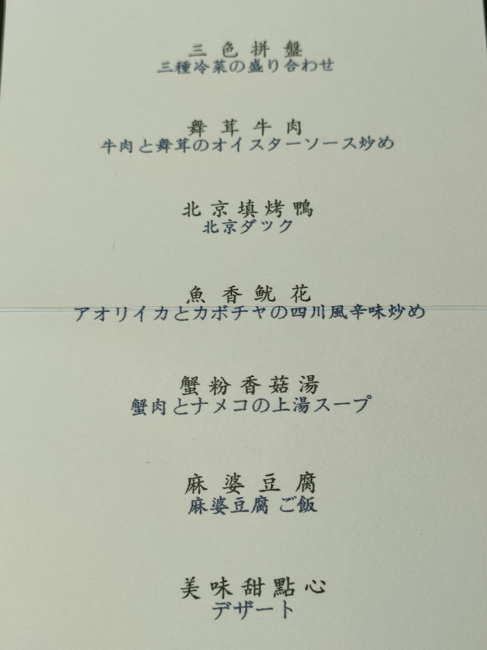コースの料理は全体を通して美味しい。ただし唯一、北京ダックはどうしても専門店の全聚徳と比較してしまうため物足りない。