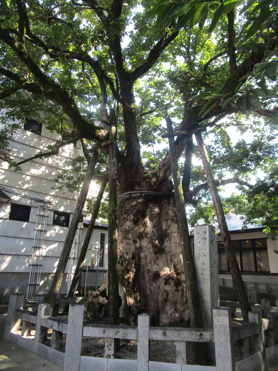 誠心館前にそびえ立つのは、高さ28.5m幹周り11.7mの見上げるばかりの大樟で、樹齢1,500年を越え、国指定天然記念物に指定されています。