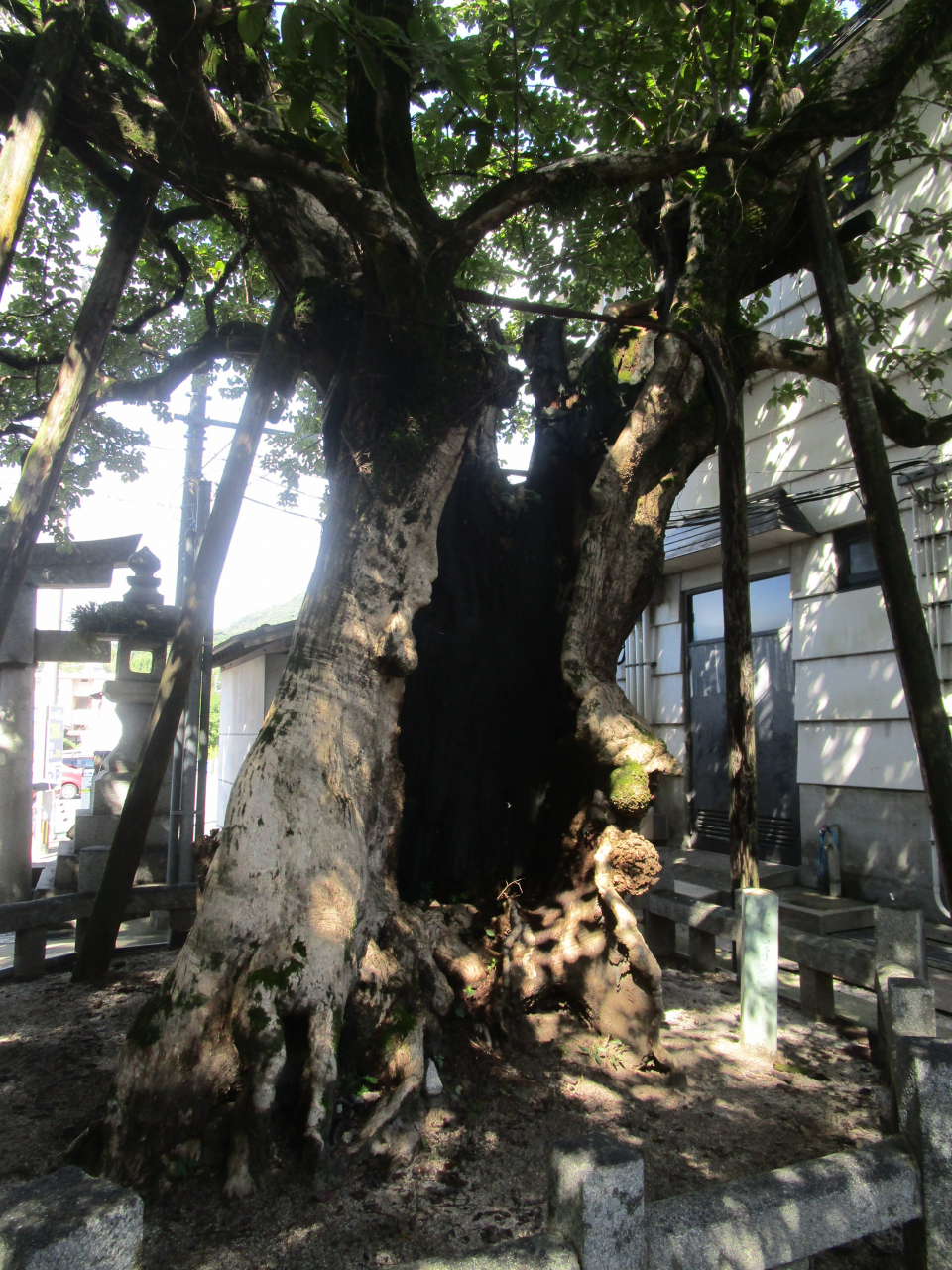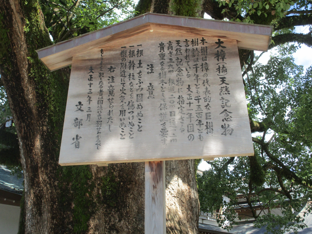 夫婦樟は、本殿後方の広い通路を挟んで6棟の摂社が並び、その背後に2本のクスノキが立っていますが、これが夫婦楠で、国指定天然記念物に指定されています。