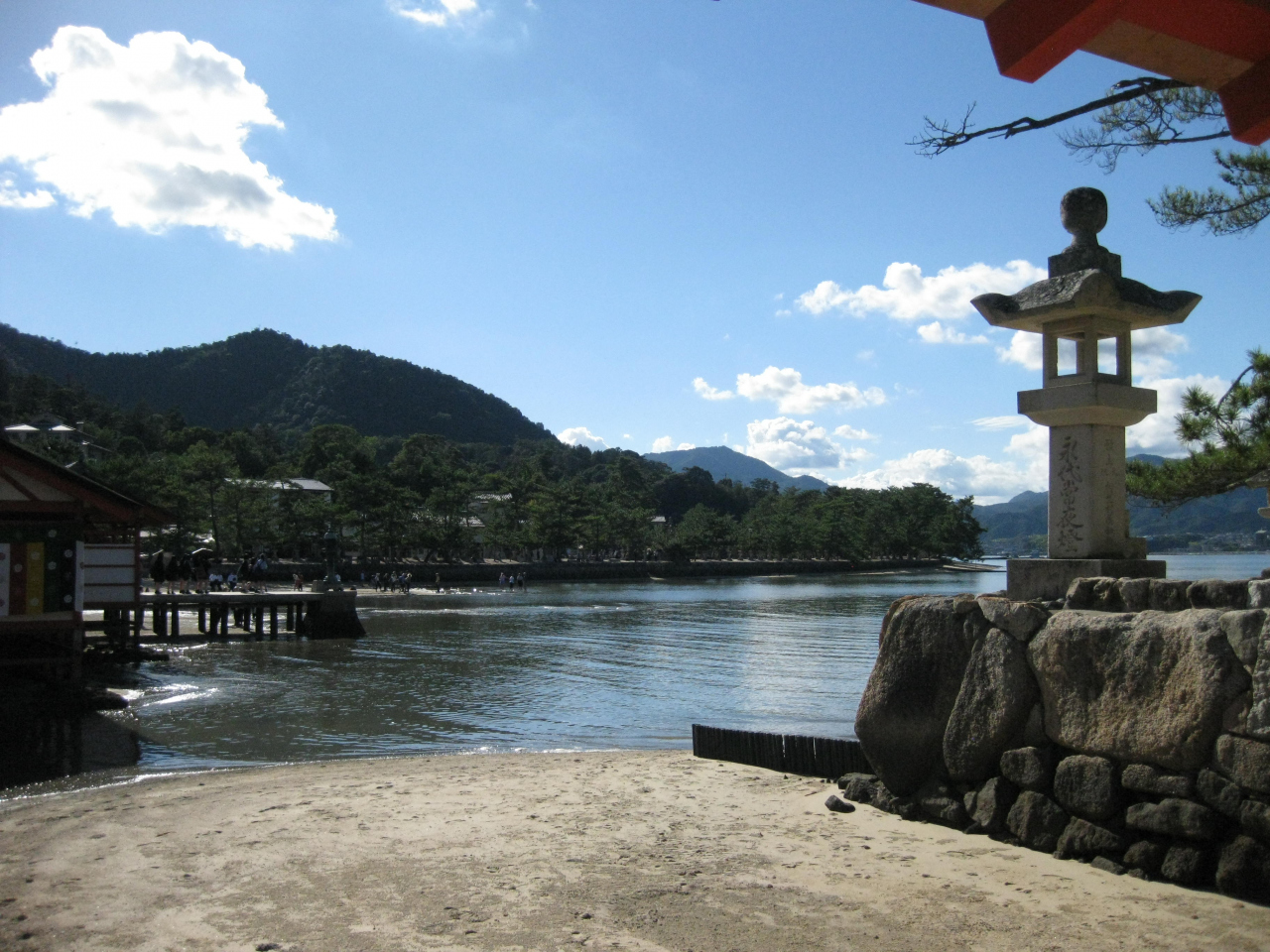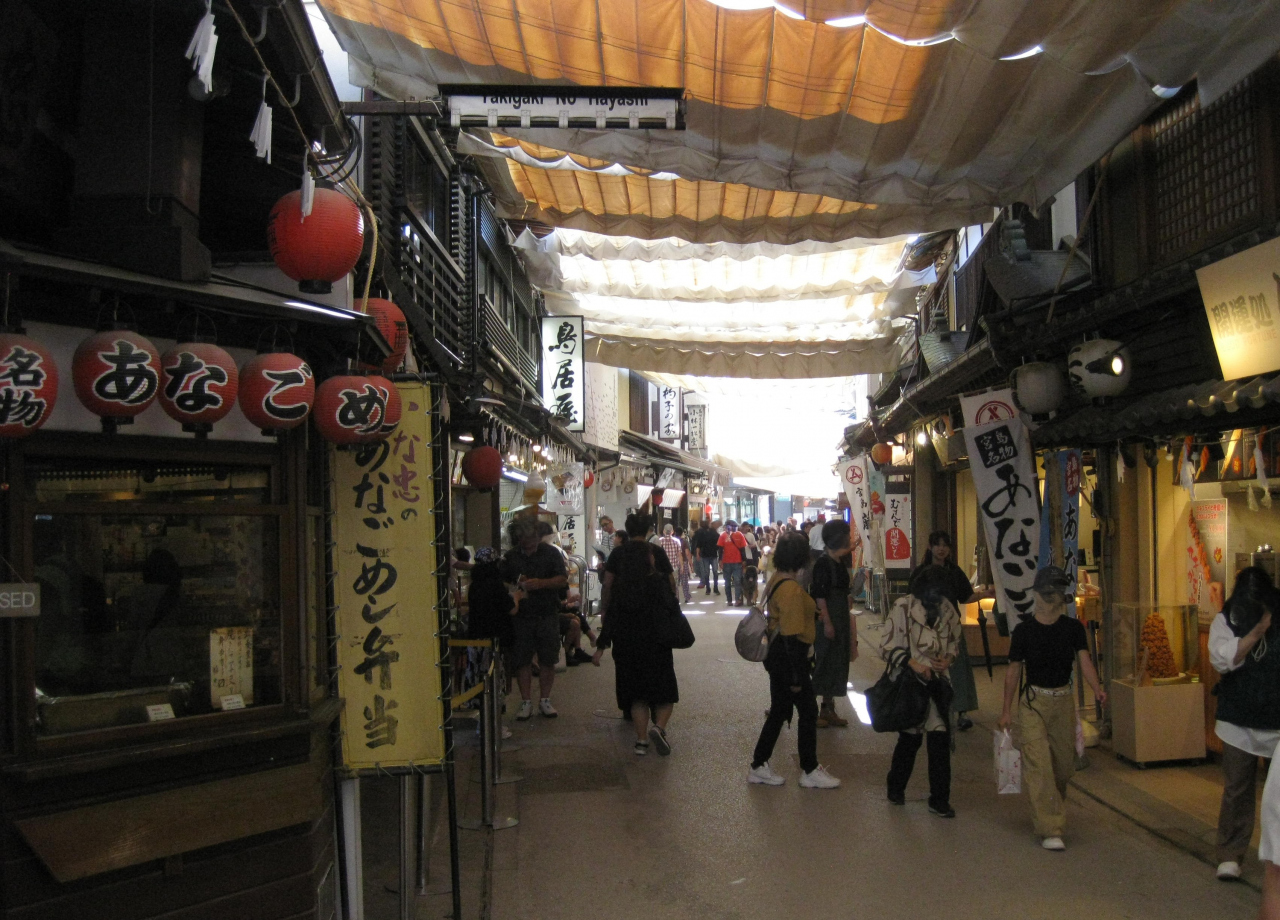 JR西日本フェリーから見える赤鳥居は小さく見えますが、実際に厳島神社から見える赤鳥居は想像以上に大きい。干潮と満潮の中間の時間帯なので、徐々に潮が上がってきます。観光客の一人が大鳥居に向かって、すねまで浸かりながら歩いていくのにはびっくり!参道の両脇には食事処やお土産屋などが軒を並べる。平日にもかかわらず観光客が多い。訪れたこの日は修学旅行中の高校生が多かったです。55年前の修学旅行で宮島を訪れたことが懐かしい。