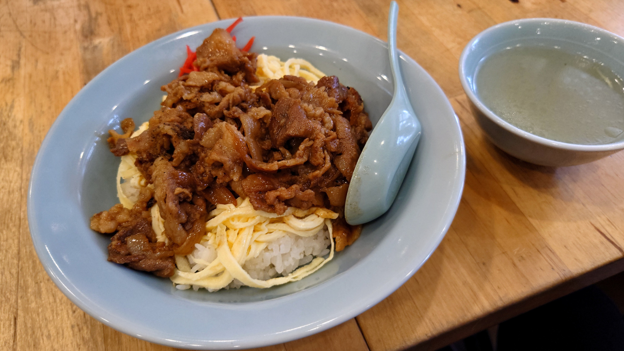 ごはんに錦糸玉子を敷いて、その上に甘辛醤油で炒めた豚肉の丼。