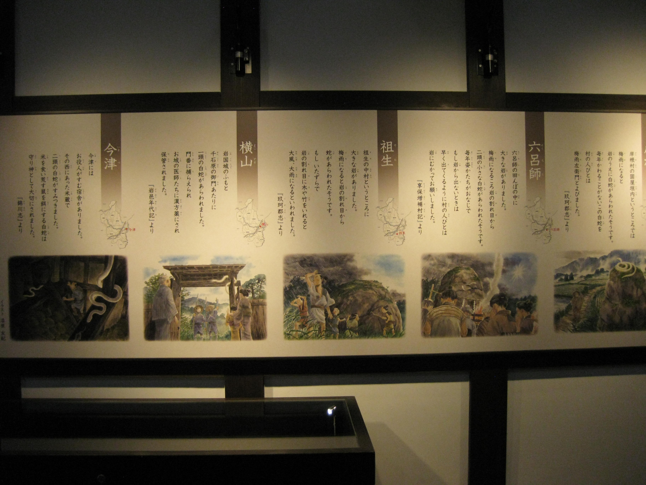 ロープウェイ乗り場から30mのところにある施設です。看板などがないとうっかり通り過ぎてしまいそうです。なぜ岩国にはシロヘビが多いのか?という疑問の説明や、シロヘビの内臓はどうなっているのかというのもよくわかる展示になっています。圧巻なのは何と言っても生きているシロヘビを間近に見られること。3匹が絡まってとぐろを巻いているのを、近くから見ているシロヘビの様子も面白い。時折、赤い目をした顔を持ち上げて、こちらを見てくれるのも何かご利益がありそう。