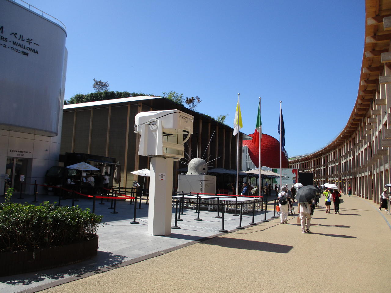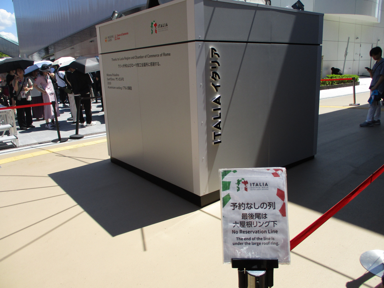 東ゲート、9時の回を予約していきました。荷物検査を経て、9時05分頃に会場内に入りました。5月に運良く入れた住友館は、9時05分過ぎに行くと、すでに入場規制がかかっていました。このためイタリア館に直行しました。9時15分くらいにイタリア館に行くと、すでに1時間30分待ちくらいの列が出来ていました。今回2回目のイタリア館の見学でしたが、トスカーノ州の紹介ということで、展示物が追加になっていました。