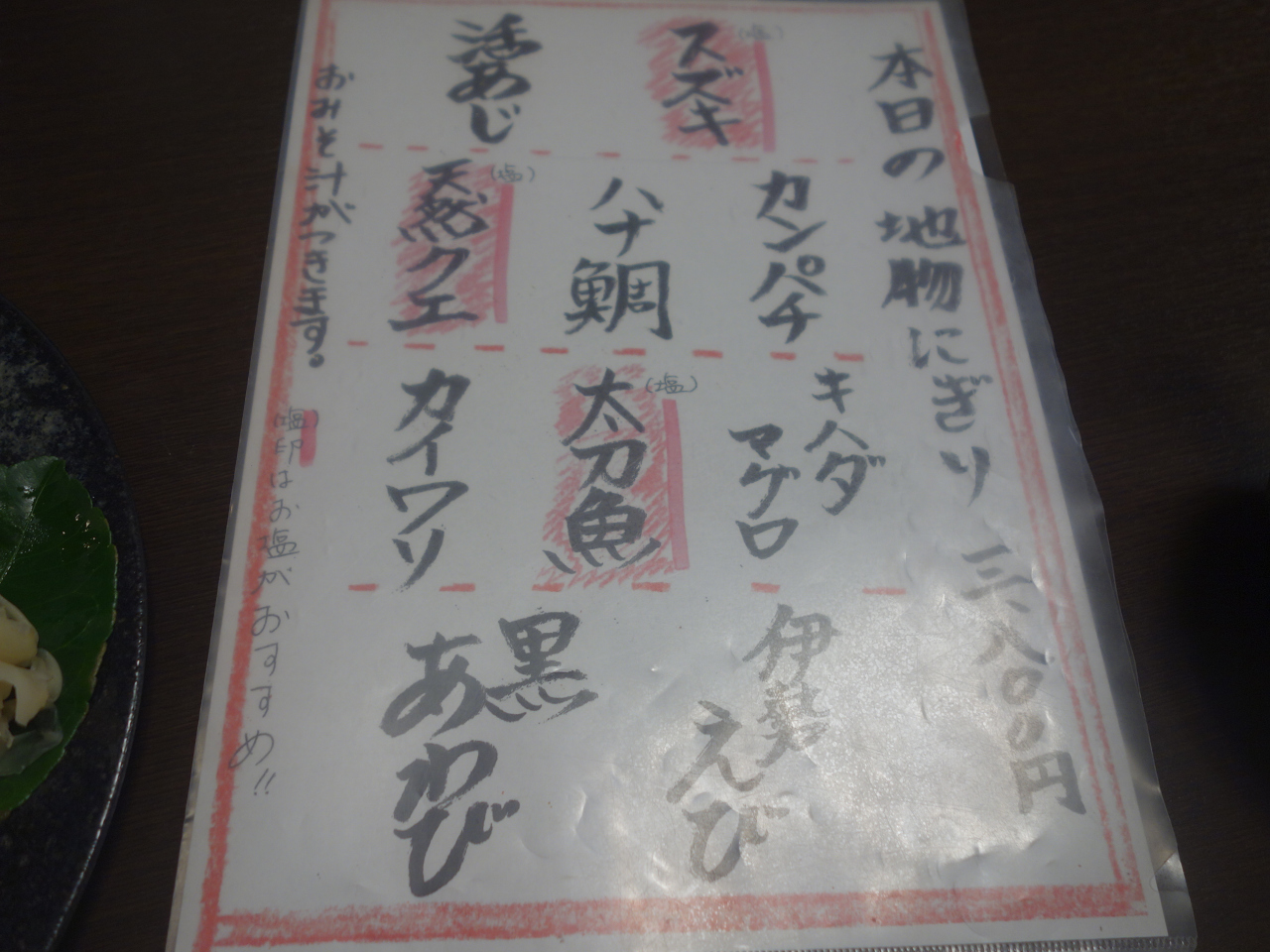 地魚の握り\3,800が看板料理です。かわった魚が出てきます。クエとか黒アワビとか。でも、正直言って、味は感激しませんでした。イマイチなのです。寿司職人の腕前のせいでしょうか。冷凍っぽく、堅かったからでしょうか。牟づかしいところです。でも、海老の爪の味噌汁はおいしかった。