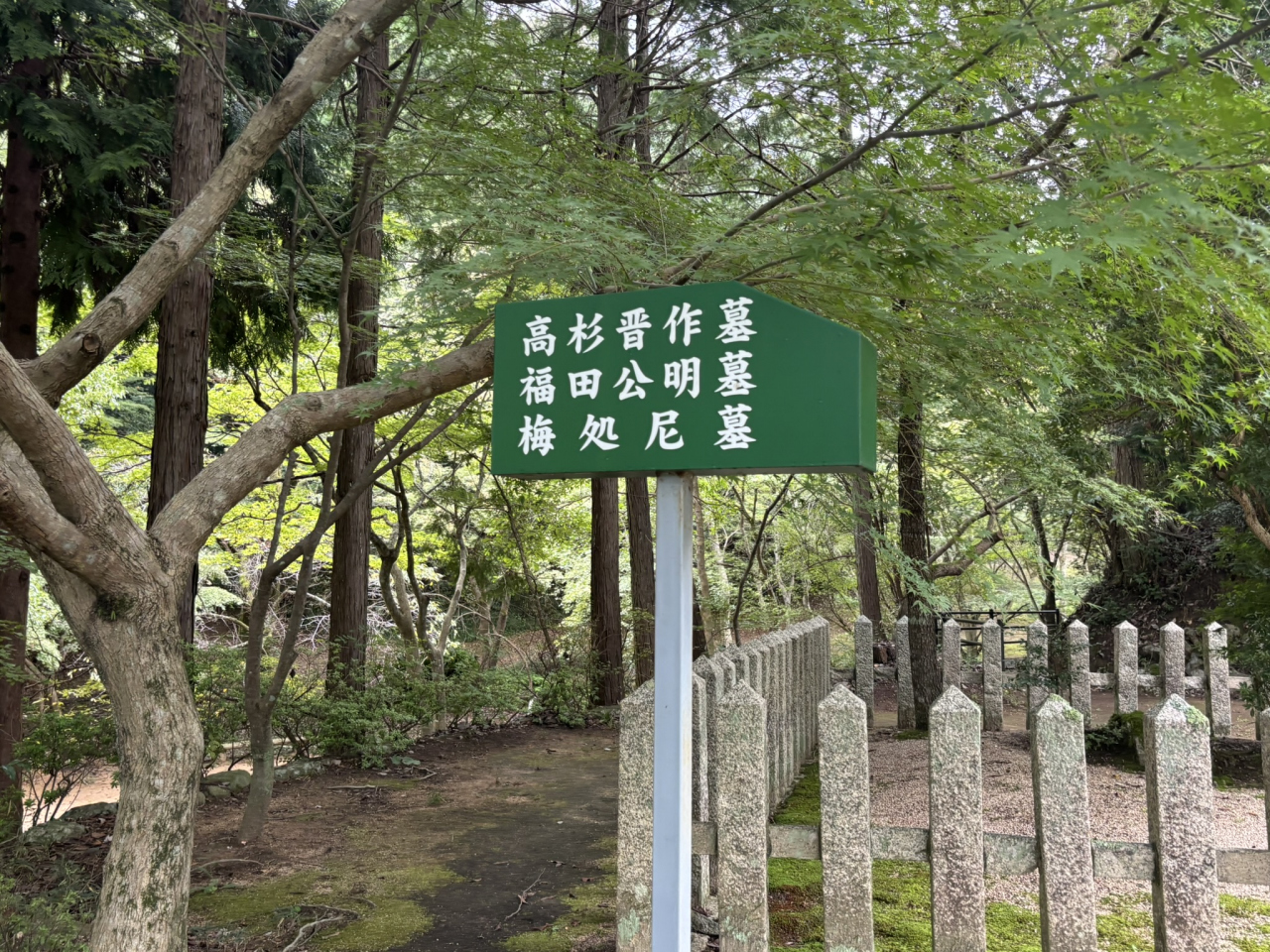 近くには梅処尼が高杉晋作のお墓を守るために墓守となり住んでいた東行庵や高杉晋作の資料が展示されている東行記念館などがあります。