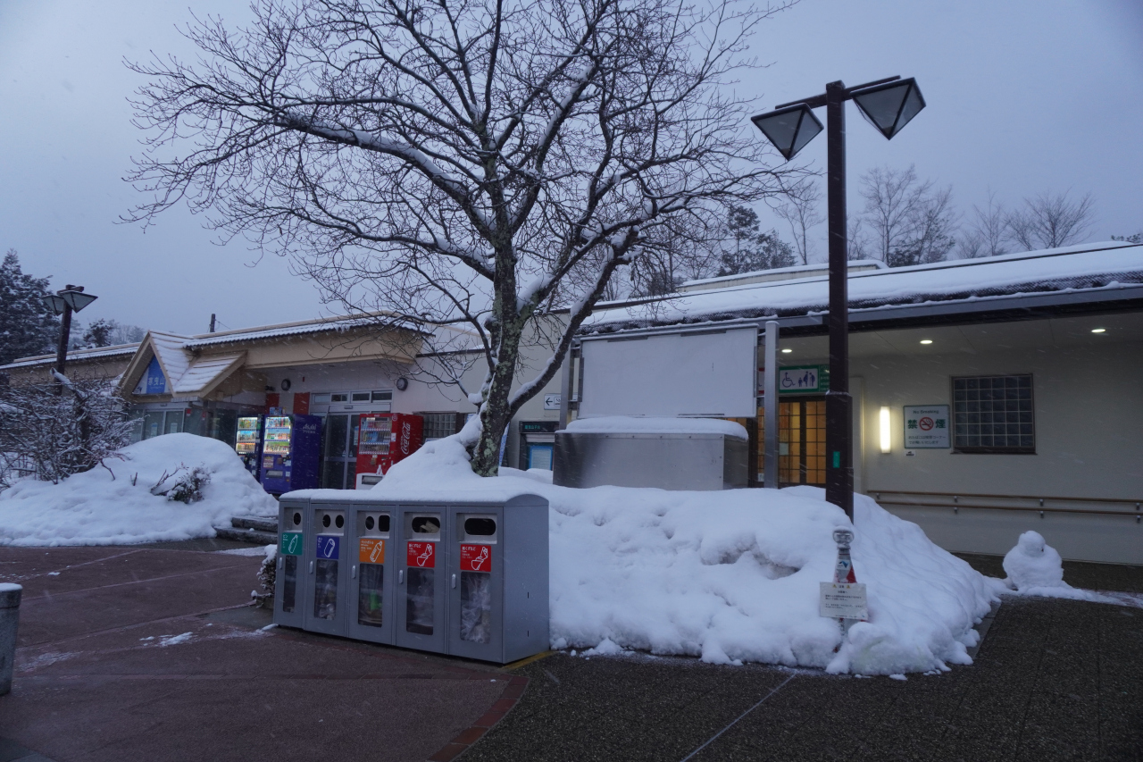 寒曳山パーキングエリアは、浜田から広島に向かういさりび号の休憩ポイントでした。雪が積もっていて寒々としていましたが、最低限の機能は備えられていて問題はなし。ただ、ここで何か楽しむというような雰囲気はありません。