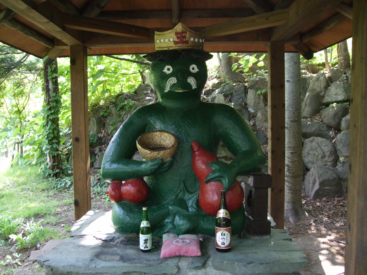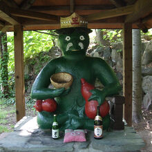 かっぱの定山渓温泉にはあちこち趣向を凝らしたかっぱの像がありますが、定山渓二見公園にあるかっぱ大王は、その代表的なものでしょう。緑の身体に酒の入った赤い瓢箪を抱える姿は、色彩のコントラストともに白い目、白いひげも強烈なアクセント。一見の価値ありのかっぱです。