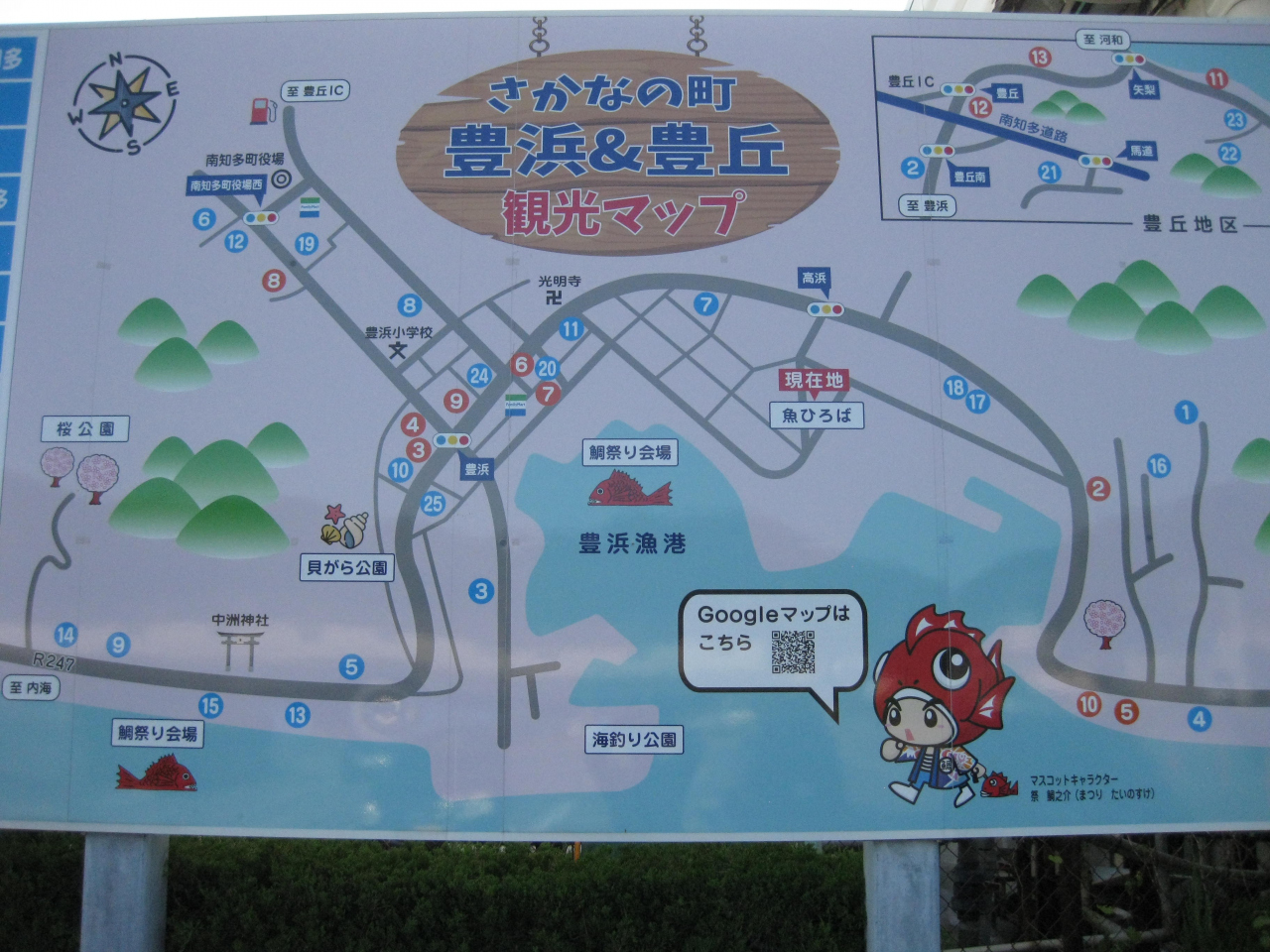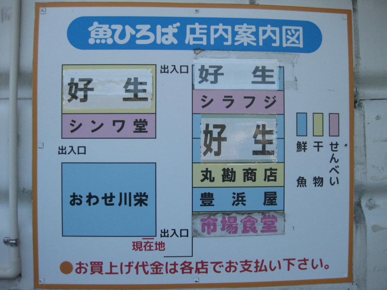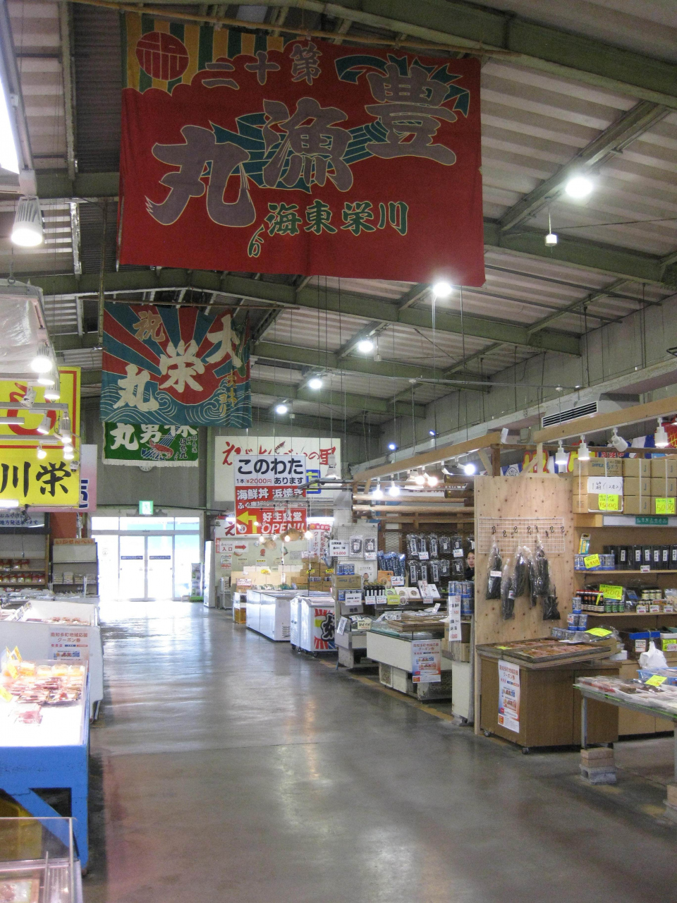 市場の前には広い駐車場があってとても便利です。建物のてっぺんには、豊浜の鯛祭りに登場するような、赤い大きな鯛がのっかっています。建物の中は鮮魚や干物などを扱う6・7軒の店舗が所狭しと通路の両側に並んでいます。通路の上には、カラフルな大漁旗が吊り下げられています。食堂もあって美味しい海鮮料理も食べられます。訪れた時間が午後二時過ぎ。お客さんはまばらでした。午前中は平日でも込み合うこと間違いなし。