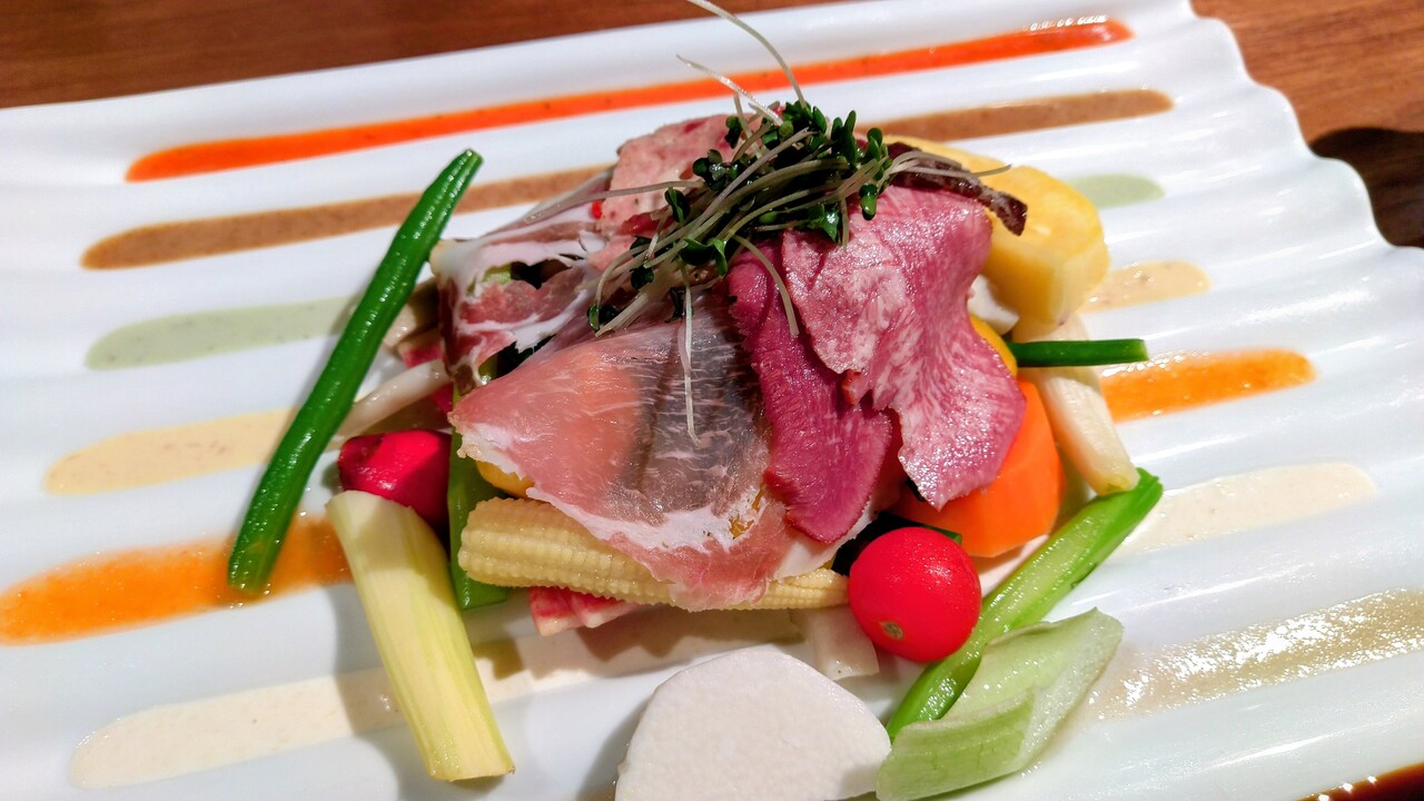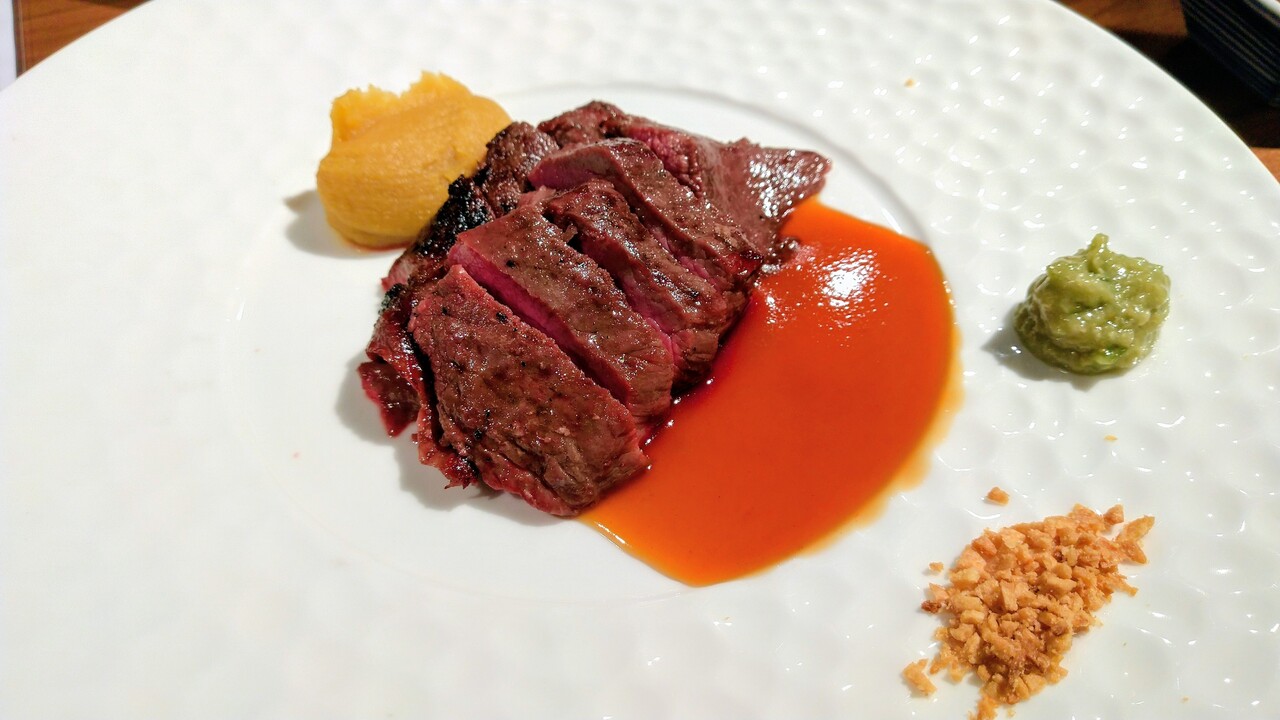 飛騨牛赤身ランチコースを頂きました。前菜のガーデンサラダは、八種類のソースが虹のように描かれており、目でも楽しむことができる一品。蕪と生姜のソースがセロリなど癖が強い野菜とマッチして美味しかったです。メインの飛騨牛ステーキは、山葵・にんにくチップ・マッシュ安納芋と共に頬張ると、何とも言えない贅沢感。この日は、金時豆と薩摩芋の土鍋ご飯でした。