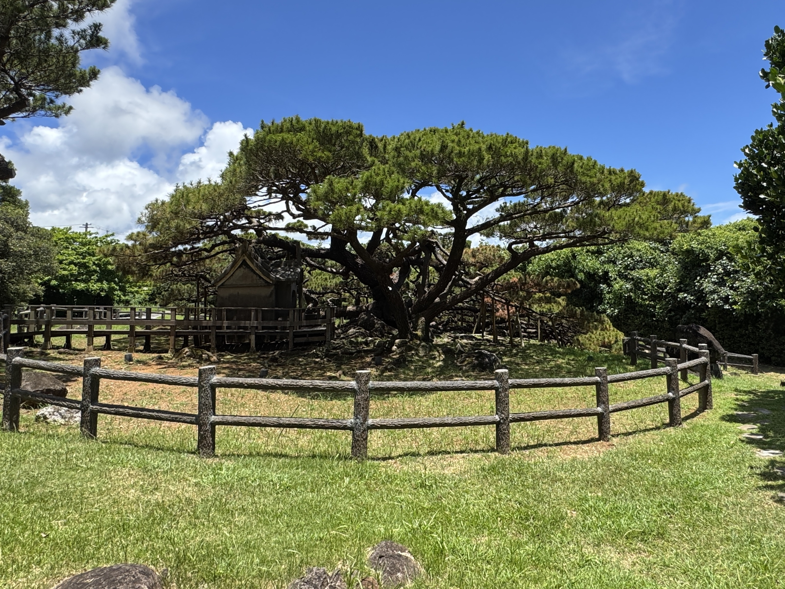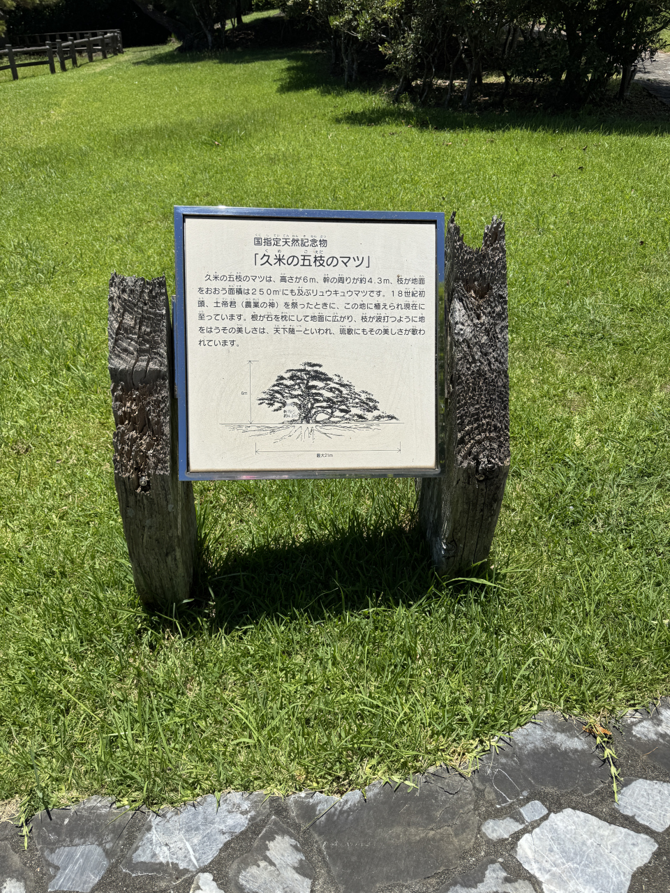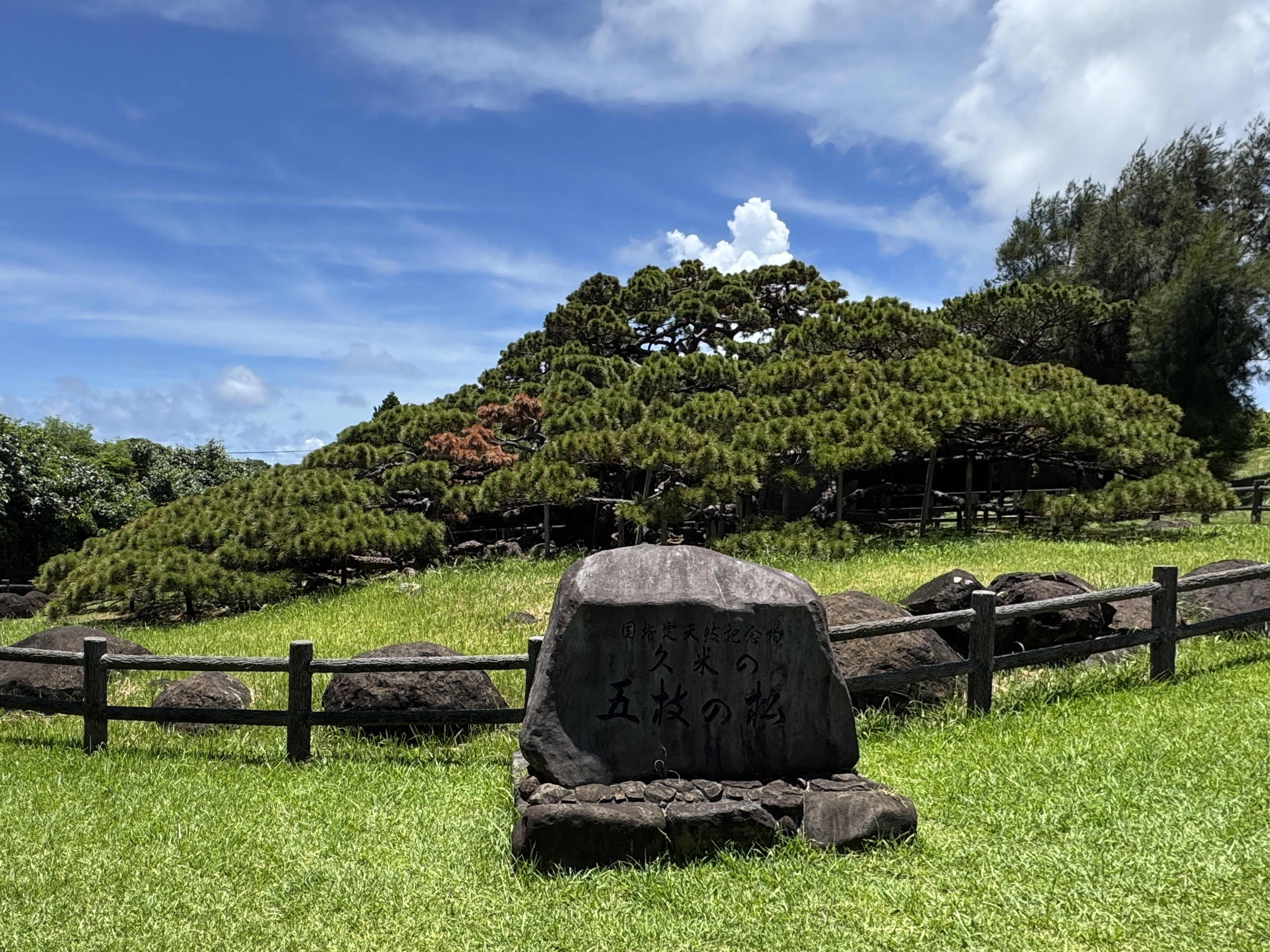 久米の五枝のマツ。国指定天然記念物として高さ6m・幹回り約4.3m・地面をおおう枝の面積250平方メートルの大きなリュウキュウマツが〝盆栽〟のように植っている。普通の松のように枝が上へは伸びずに地面を這うように波打って伸びているのが特徴であるこの五枝の松は樹齢250年と言われている。18世紀の初頭に農業の神を祭った時に植樹されたと記されており、その美しさは琉歌にも詠まれる程で天下随一と言われて久しい。故に現在では日本の名松百選にも選ばれている程である。長きに渡って久米島の〝顔〟とも言える存在感をキープしてきた名木の古木である。