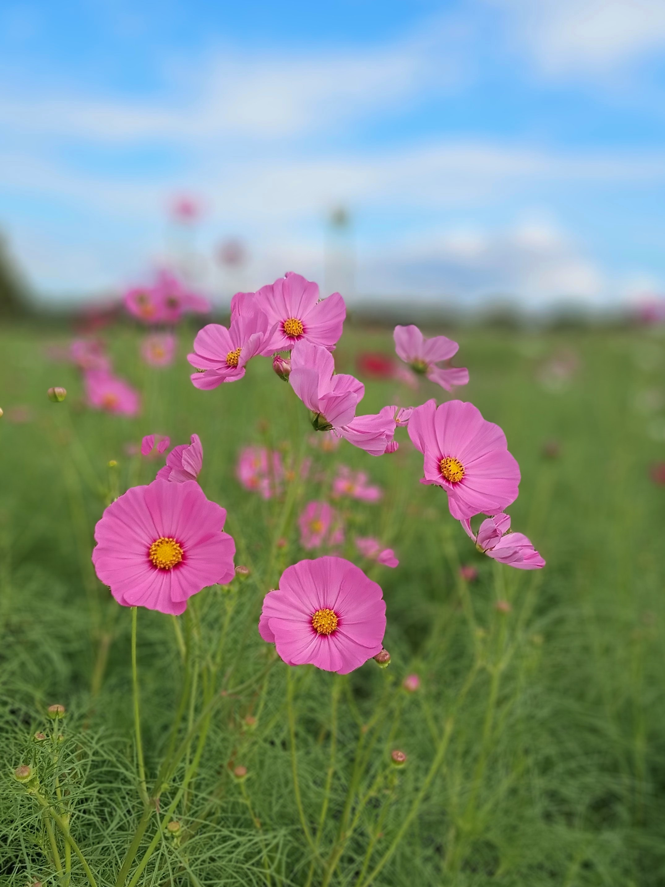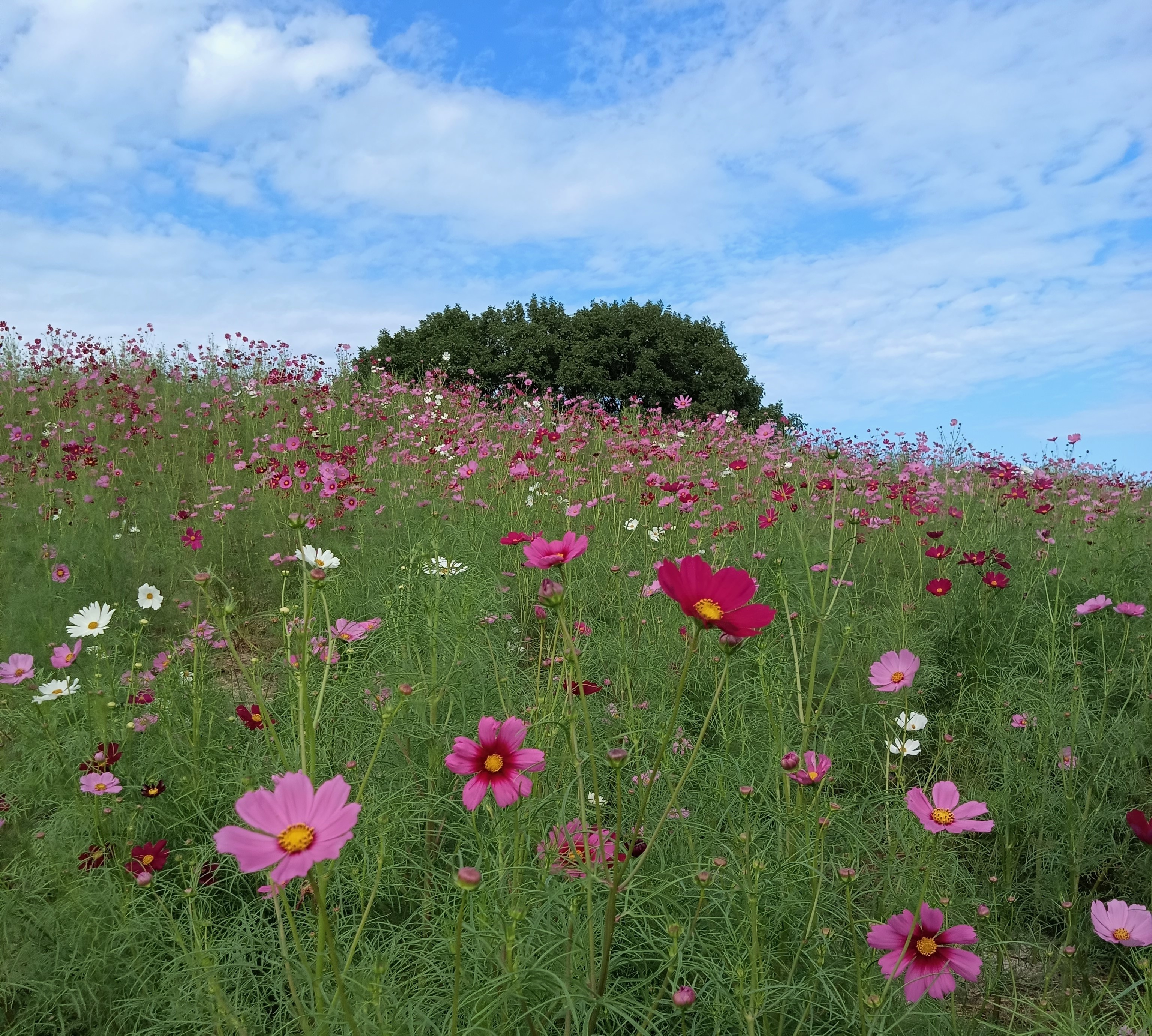 コスモス畑の散策は至福の時、ピンクや白など淡く優しい色の花に心和みます。