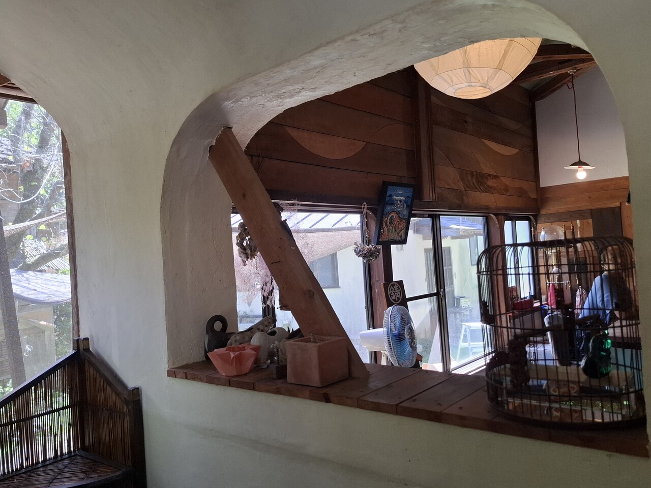 益子の町中からはちょっと離れています 雨巻山へ向かう細い道を進んで山の中に入っていきます この道大丈夫?と言うくらい周りは木々だらけ・・ぽつんと小さなお店が目に飛び込んできます ドアの先は完全に別の世界観で、木をふんだんに使った手づくり感満載!