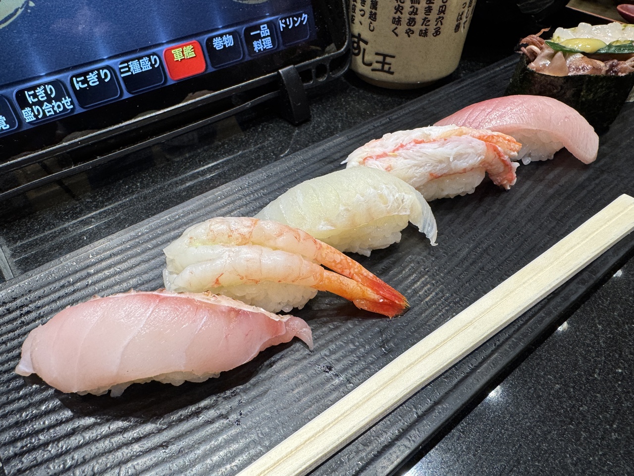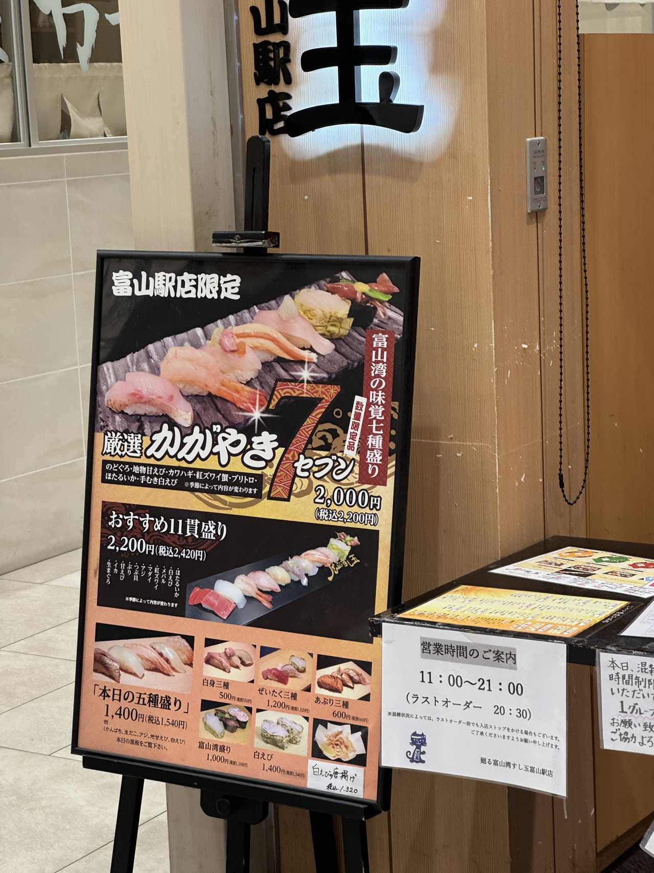富山に来たからには、天然の生簀といわれる富山湾の美味しい海の幸をリーズナブルに味わいたいですよね。JR富山駅の「きときと市場とやマルシェ」内にある「廻る富山湾 すし玉 富山駅店」は北陸の仕入れ漁港から直送のネタをリーズナブルにいただけるお鮨屋さんです。その立地と価格からいつも行列です。特に富山湾の新鮮な幸が売りの『かがやき7』2200円はすぐ売り切れてしまうようです。