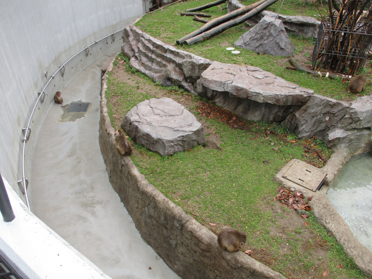 円山動物園 サル山に檻や網はないので、さえぎるものがない状態でサルたちを観察することができました。サルはジャンプ力があるので、低いところや、遠いところに位置させていました。見物するときは、高いところから観察するような感じでした。