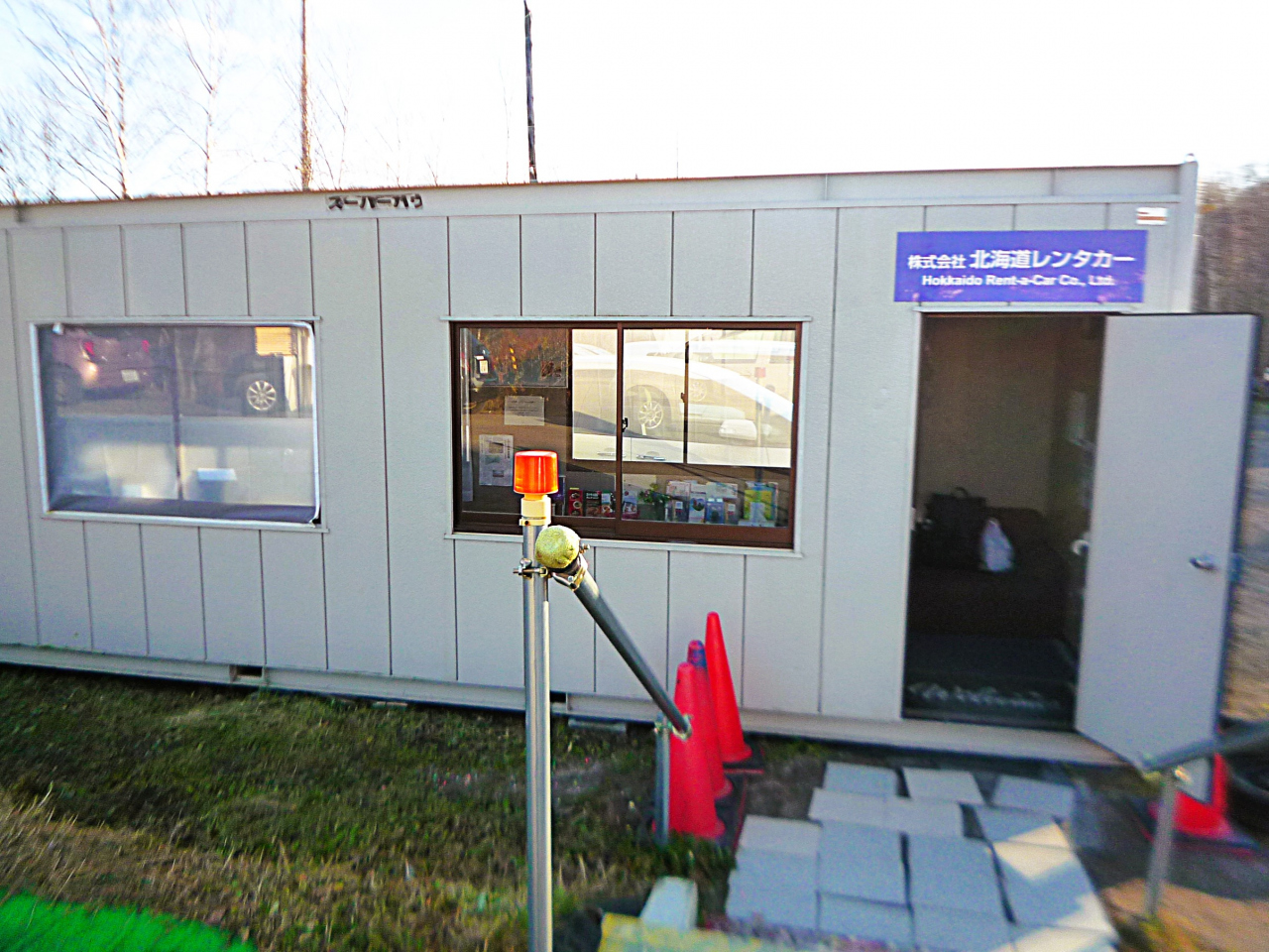 到着ロビーから電話して20分後、乗車して10分ほどで事務所に着きました~、場所が空港周辺では無く苫小牧植苗なので離れてます?…、レンタカー屋というよりは中古車販売所と言った雰囲気でプレハブ小屋が有るだけです(まさに余計な経費は省くです)。