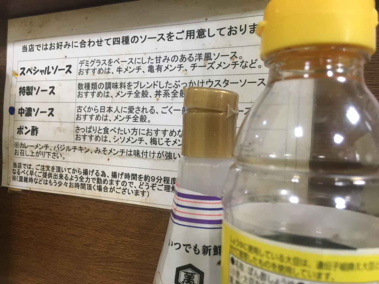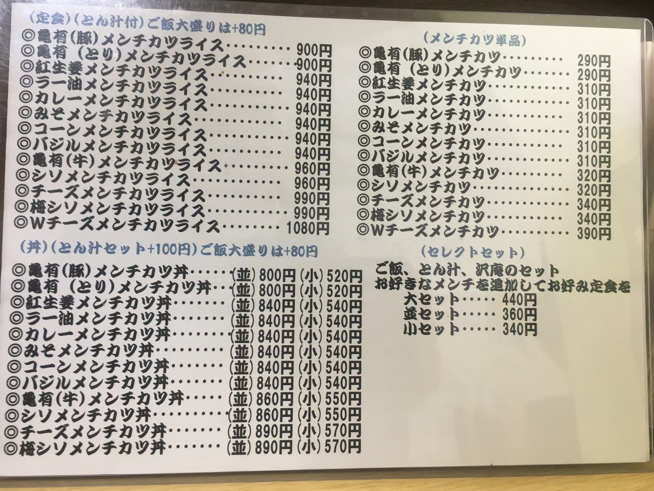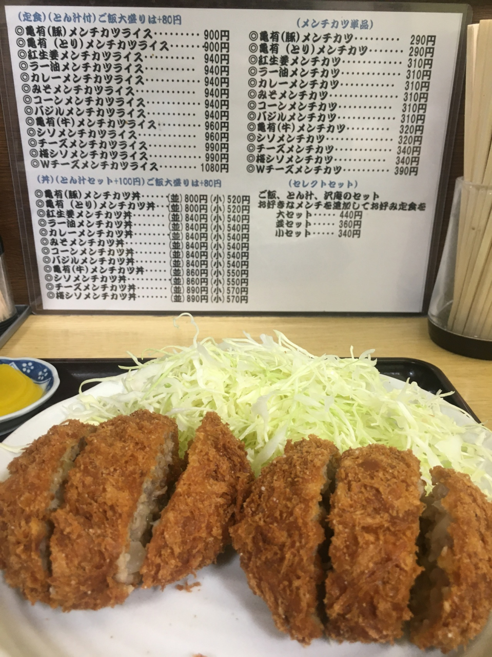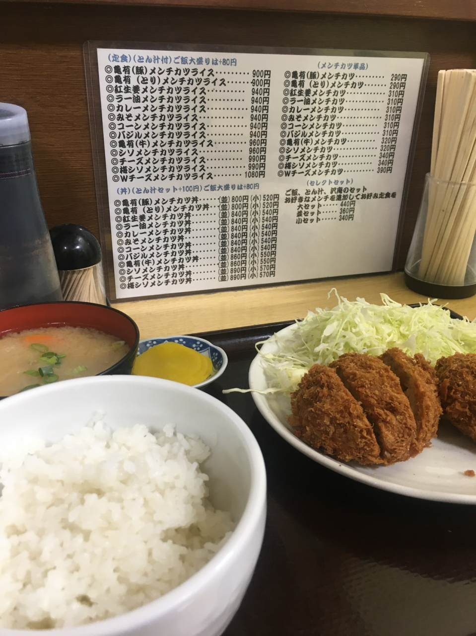 店頭でも単品でメンチ類を販売していて買って帰る人も多かったです。店内はカウンター席10弱、4人座れるテーブル席が2つありました。メニューをを見るとメンチカツしかなかったですが種類がたくさんあり、丼品も多数ありました。亀有(豚肉)メンチカツライスのを注文。ご飯、とん汁付きです。昼時に訪問したので注文してから提供されるまで15分ぐらいでした。肉厚のメンチで肉汁も少しあり、ソースはテーブルに4種置いてあったので全て試して食べました。