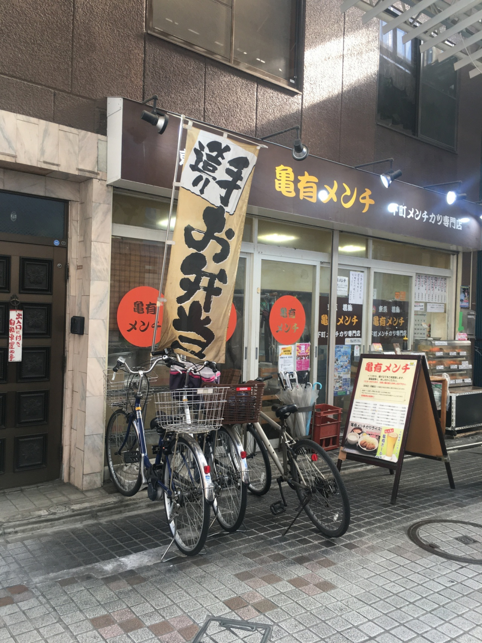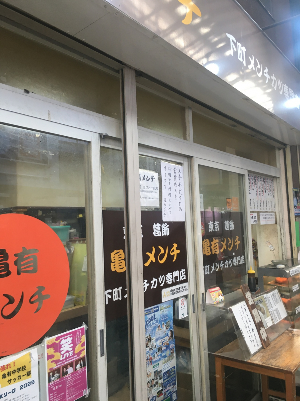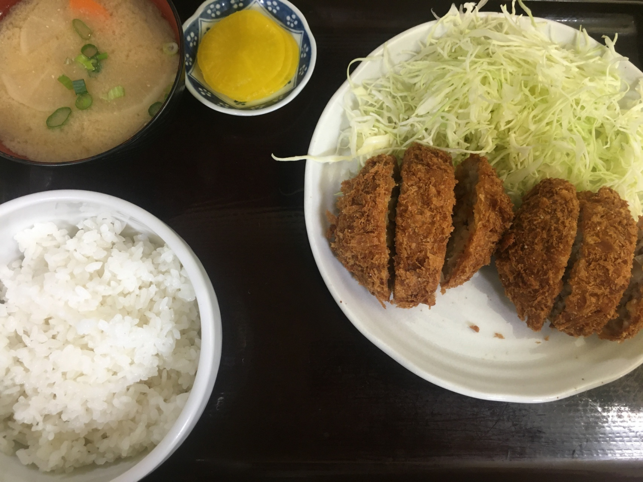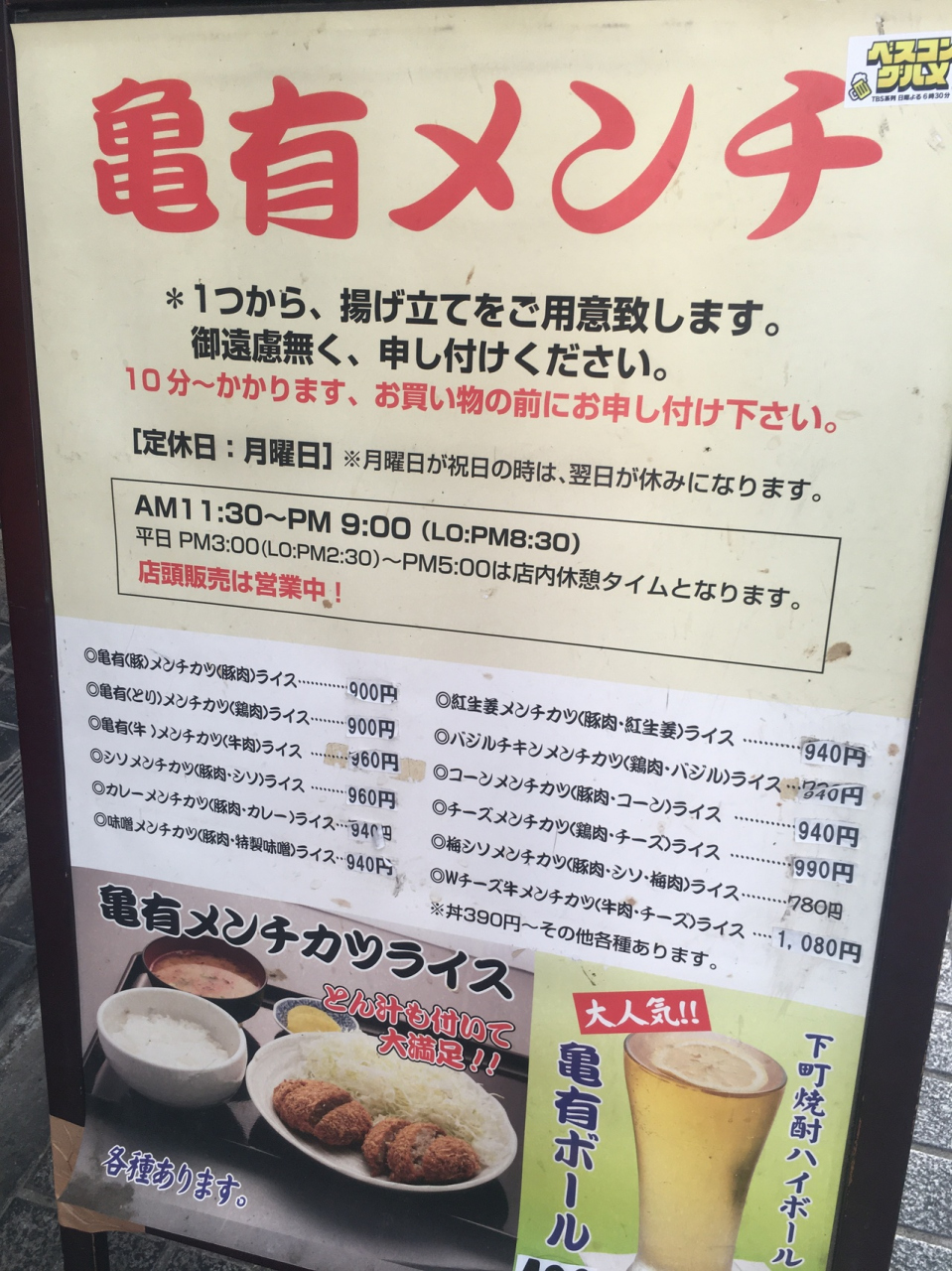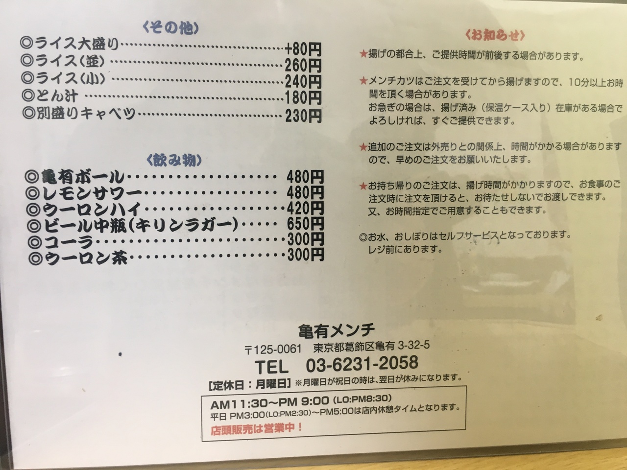 店頭でも単品でメンチ類を販売していて買って帰る人も多かったです。店内はカウンター席10弱、4人座れるテーブル席が2つありました。メニューをを見るとメンチカツしかなかったですが種類がたくさんあり、丼品も多数ありました。亀有(豚肉)メンチカツライスのを注文。ご飯、とん汁付きです。昼時に訪問したので注文してから提供されるまで15分ぐらいでした。肉厚のメンチで肉汁も少しあり、ソースはテーブルに4種置いてあったので全て試して食べました。
