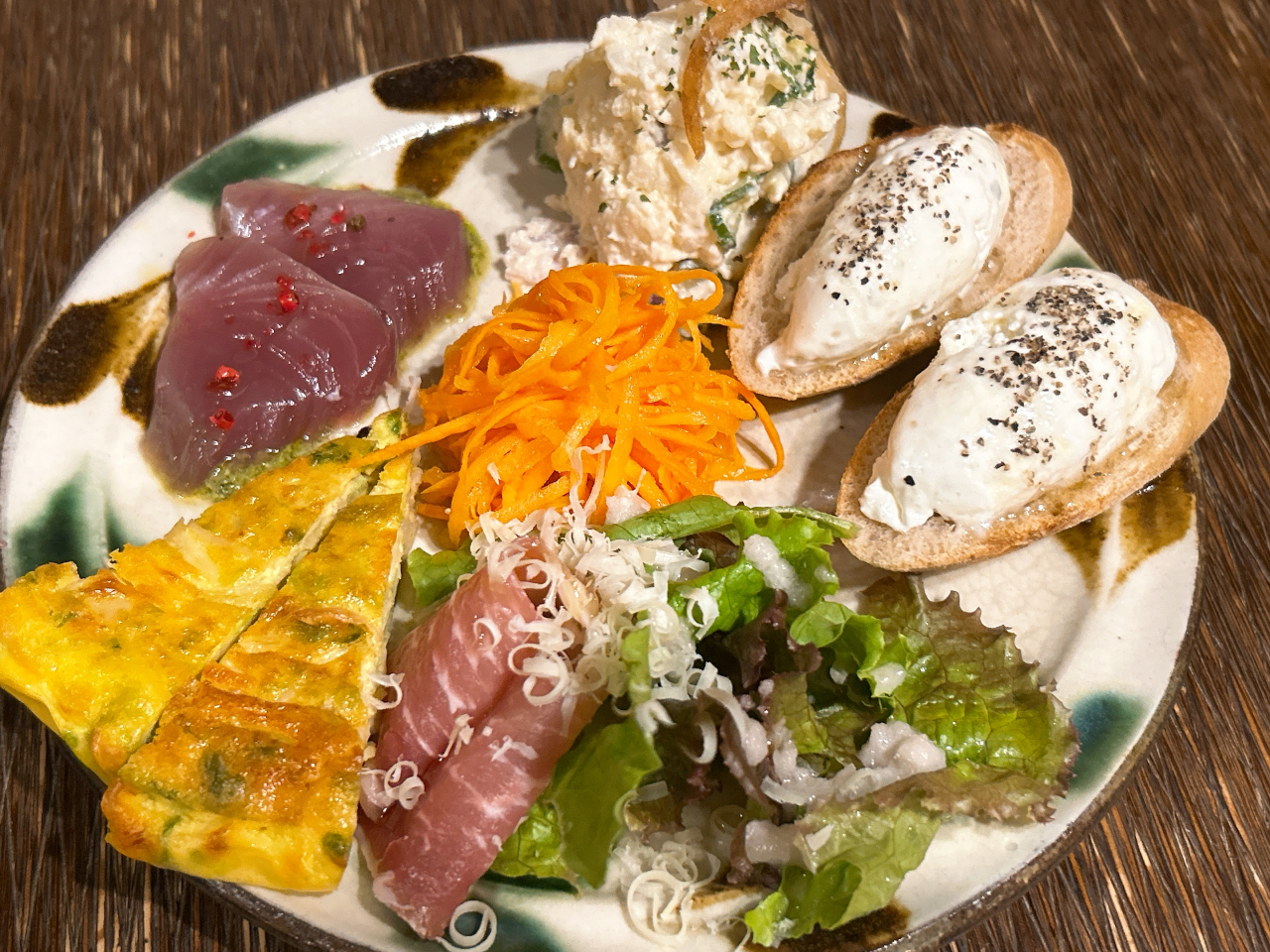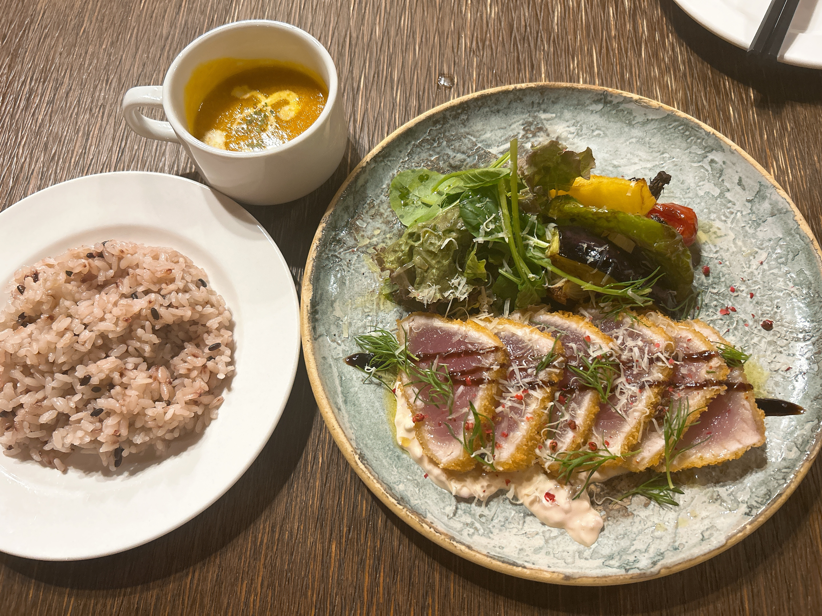 メインメニューは、盛沢山の前菜盛り合わせにスープ、パンまたはライス付。