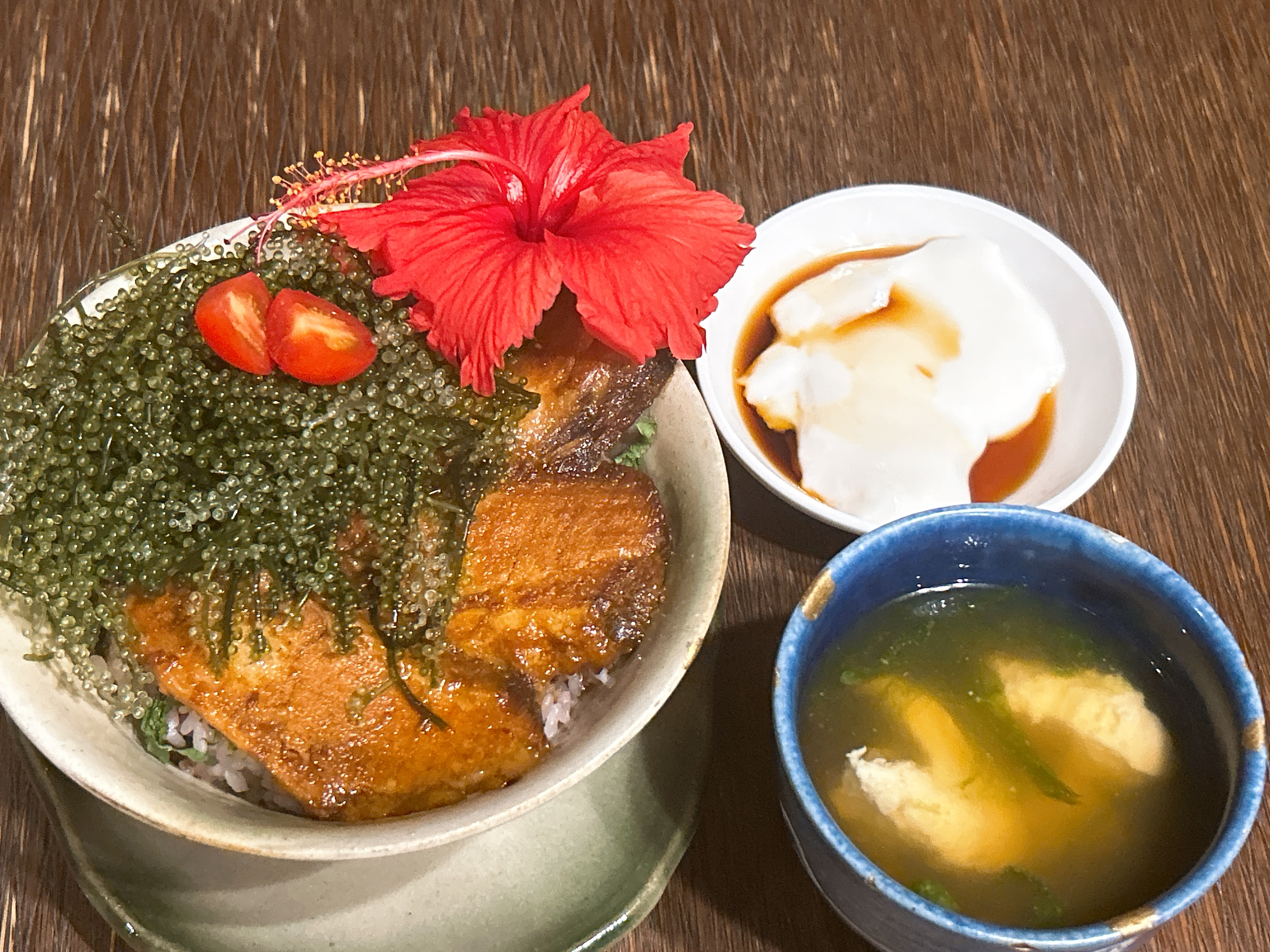 ランチでも提供されている「海ぶどうとアグー豚の丼ぶり」はややイメージと違って、豚肉のジューシーさよりもタレの濃さが勝っている感じ。