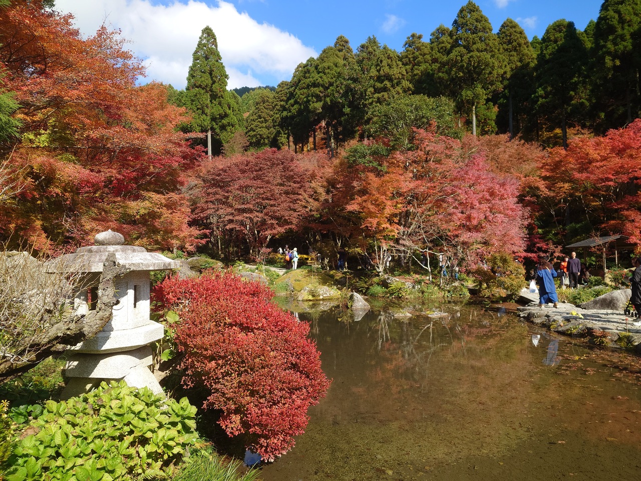 紅葉3連休の中日に訪問。10時頃に到着したため、駐車場に入るまで2時間待ちの大人気でした。さすがにトイレに行きたくなりましたが、男性は待ちなしだったものの女性は20分待ち。女性の方は気をつけて。こちらは紅葉とテーブルの写真で有名ですが、もうお昼だと1時間待ちなので、入らずに周辺を散策して終わりました。紅葉の時期は朝一の訪問をオススメします。