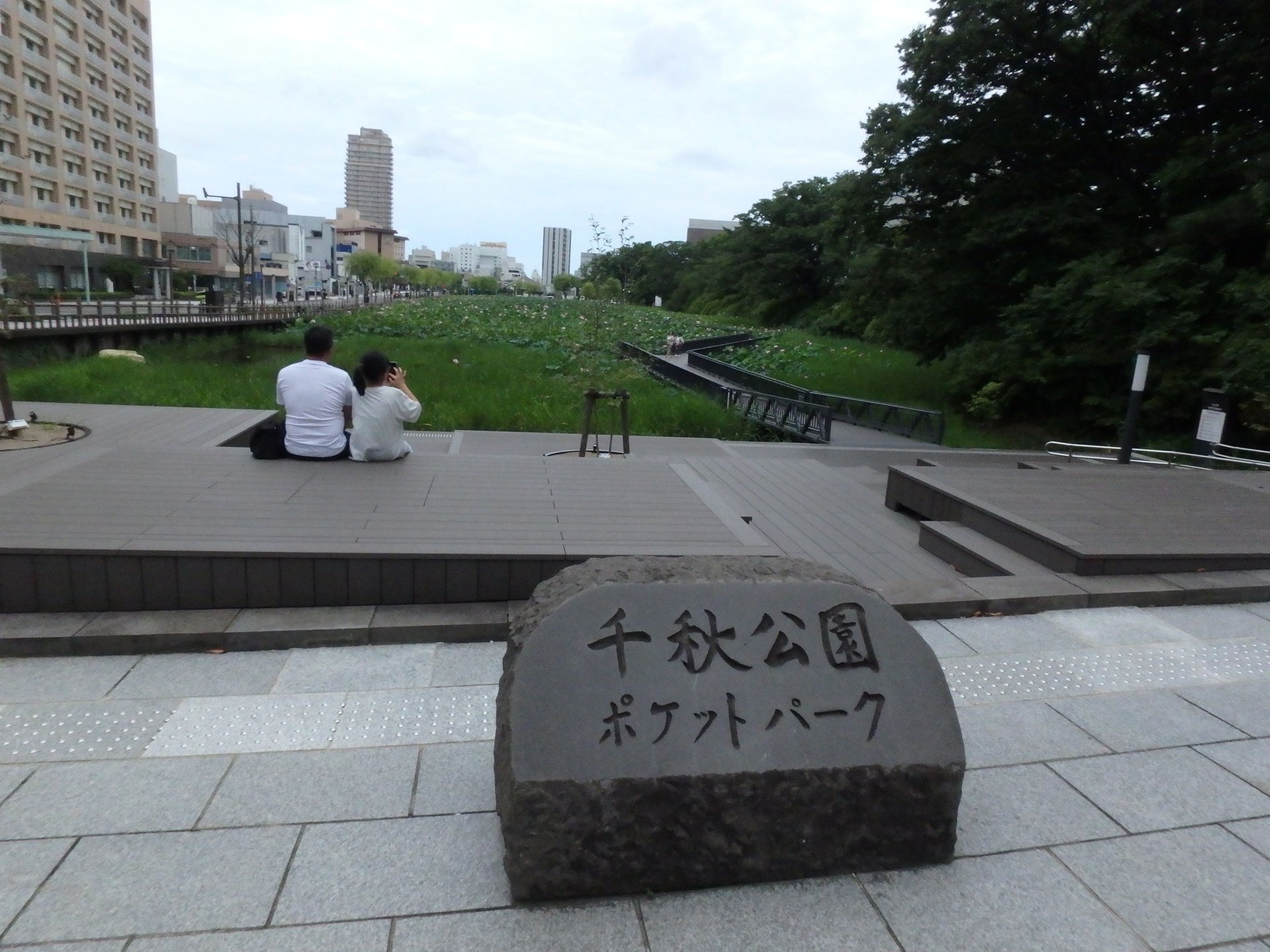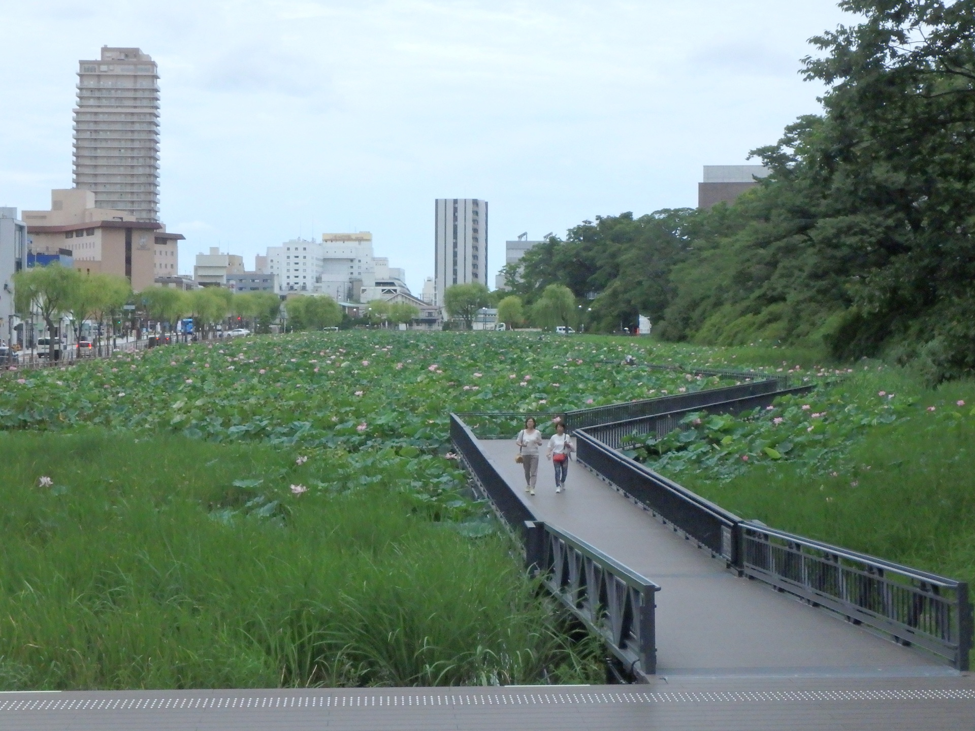 蓮の花が咲くお濠の中を歩く
