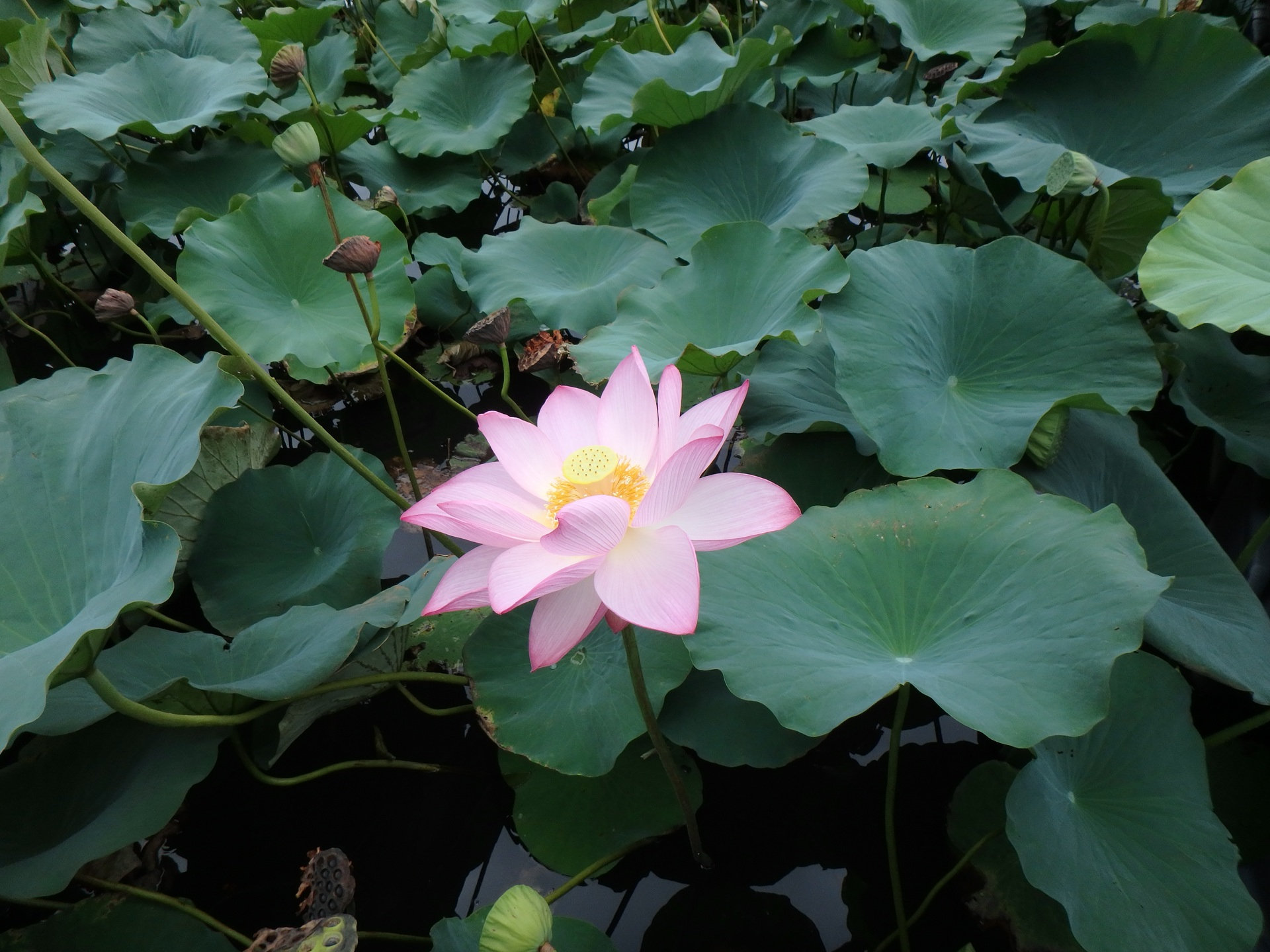 泊まっていた秋田駅前のホテルから秋田市民俗芸能伝承館へ向けて朝の散歩。その途中に久保田城祉を中心とした千秋公園を歩く。お濠には蓮の花が咲いていて、その中にフロート式の遊歩道が設置されていて蓮の畑の中を歩いていくような不思議な感覚。おかげで蓮の花を間近に観察することもできて、朝の散歩が充実したものになった。