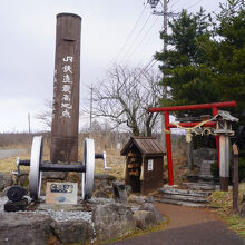 JR鉄道最高地点は、野辺山駅と清里駅の間。野辺山駅からは約2.3kmの地点で、標高は1375m。小さな神社とその隣りに「JR鉄道最高地点」の標柱が建っていましたが、その小さな神社が鉄道神社。レールと車輪が祀られているようです。