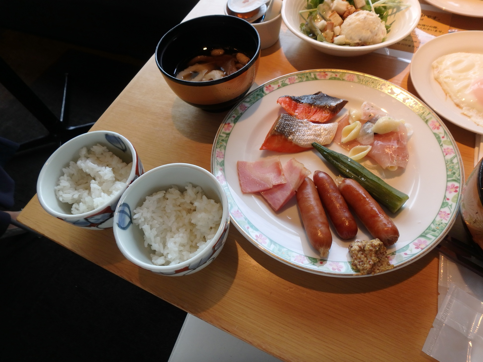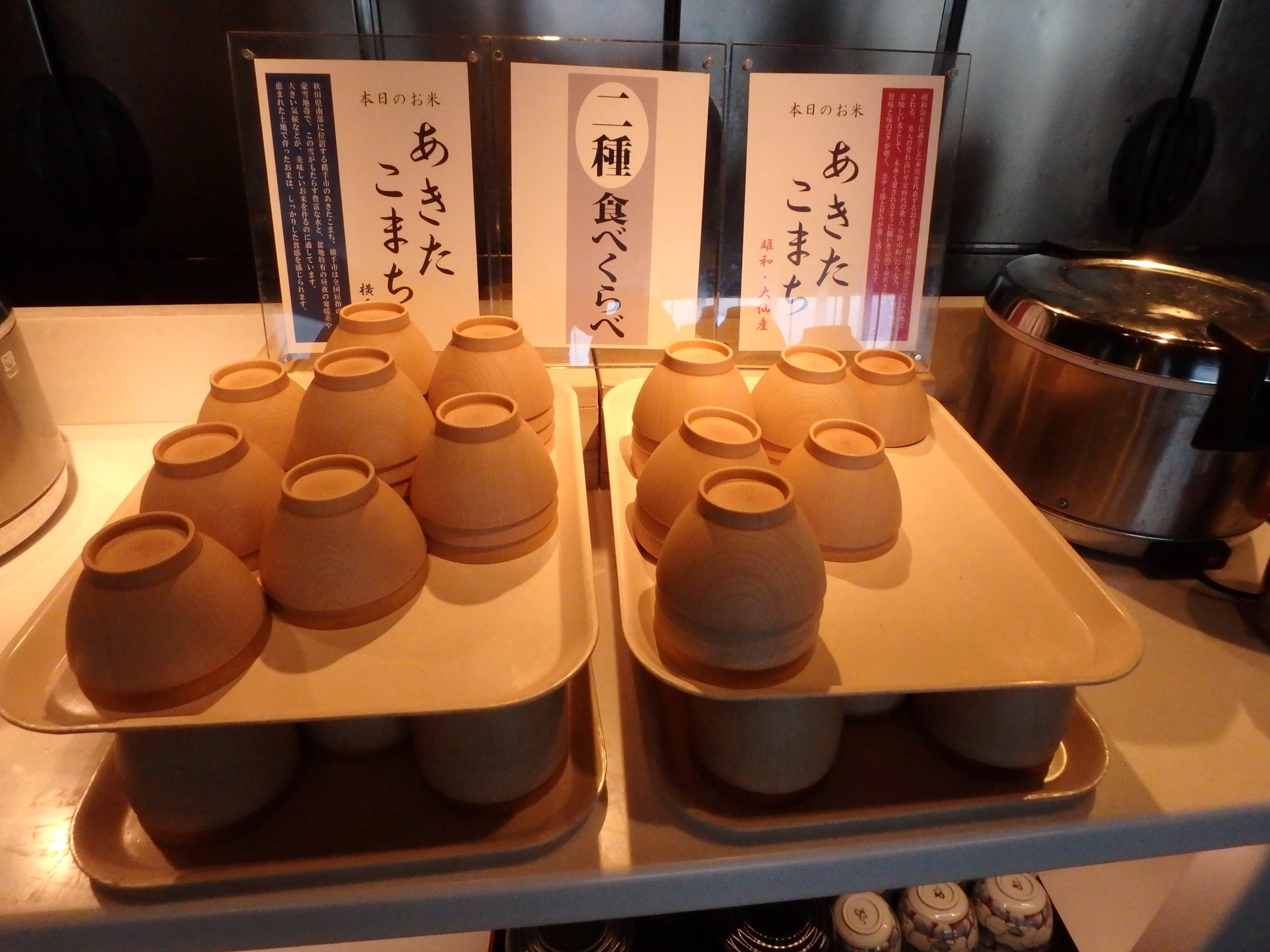 朝食はブッフェ方式で提供されていてメニューは豊富。秋田ならではの料理も多くどれを食べようか悩んでしまう。ご飯は2つの生産地の「あきたこまち」があり、横手産と雄和・大仙産が用意されていた。ただ同じ雄物川流域が産地なので仁賀保あたりのお米を用意していたら良かったかな?でも、私の貧乏舌では味の違いは判らないだろう。他にはきりたんぽ鍋や稲庭うどんも用意されていて、朝から食べ過ぎになってしまった。