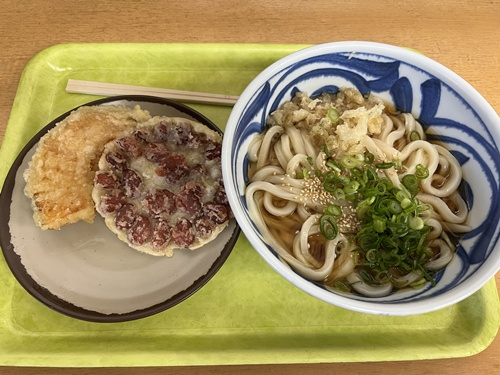 讃岐うどん、1食めがカレーうどん、2食めが釜玉。この朝、3食めは「ぶっかけ」と進行したはずがその後の動揺で記憶あいまい。なぜならふとした気の迷いから(2玉の)「大」いっとくか、とまではよかったものの、ズラリ並ぶ天ぷらに魅了され、かぼちゃ天ともう一種類を欲張ってしまいました。