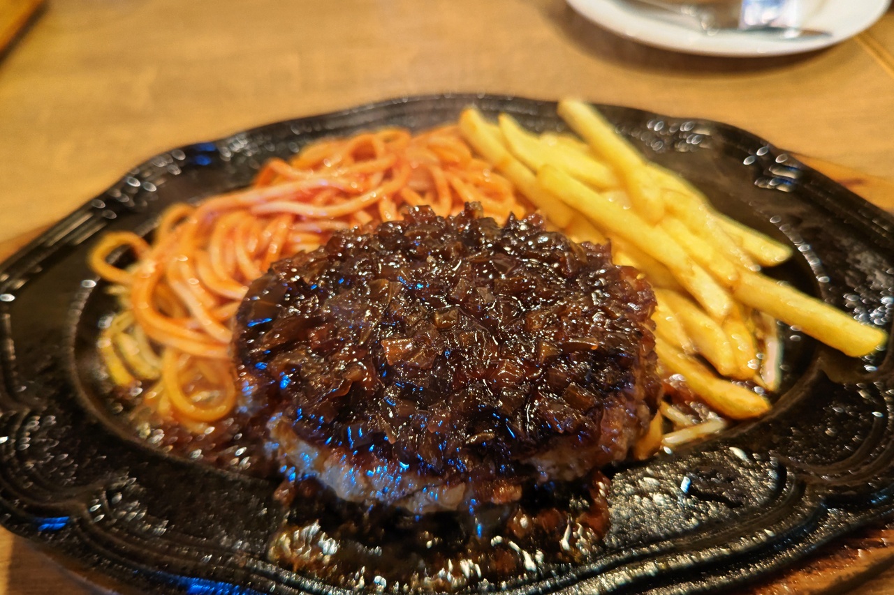東海通店の外にあるカウボーイ人形を見て覚えた店。自宅に近い東海店にランチ来店しました。アメリカンな店内。粗挽きのほとんどステーキというハンバーグを注文。レアなハンバーグでした。ボロボロこぼれる感じで、好きな人ははまると思います。