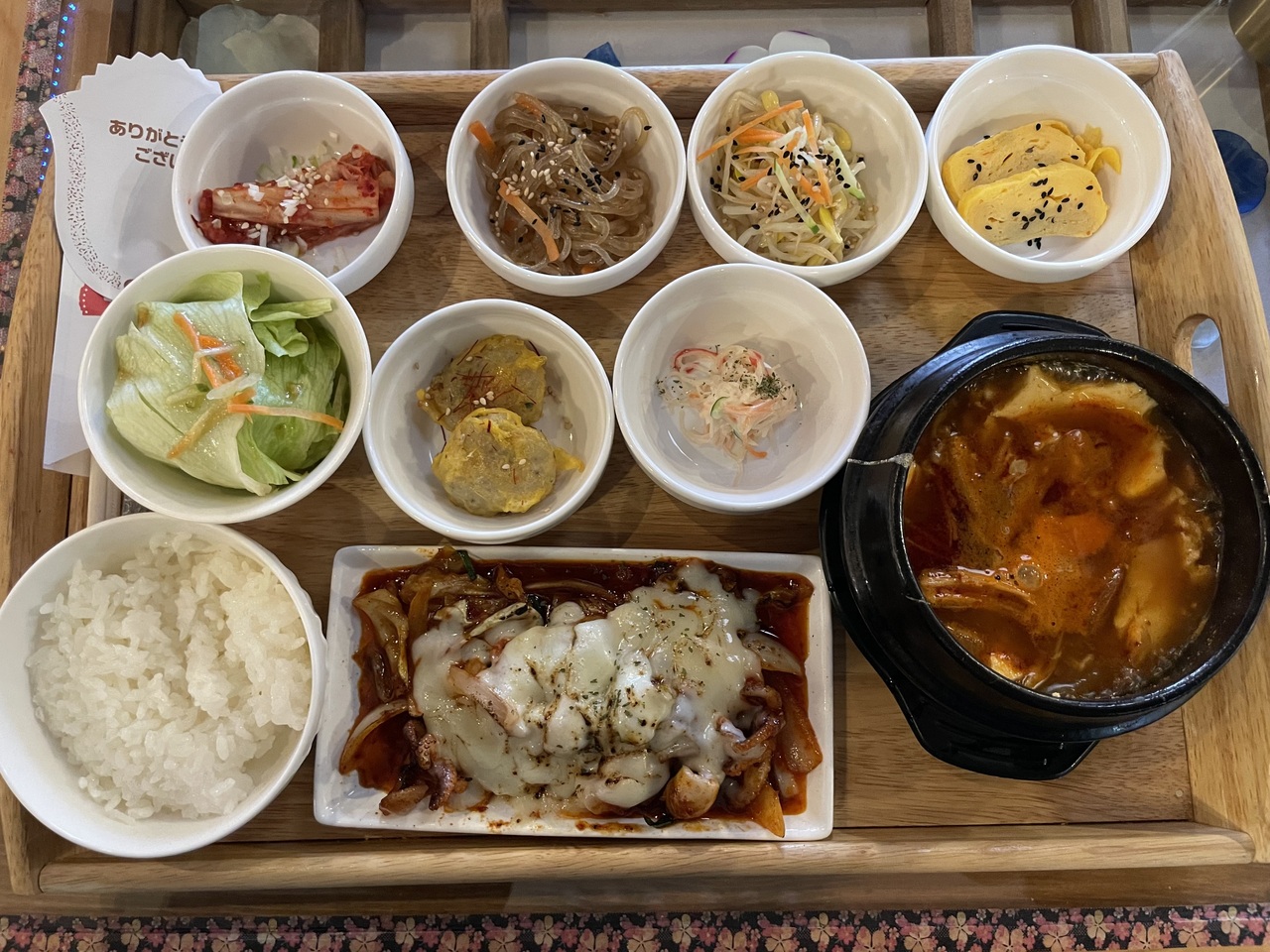 休日はオープンの11時から満席になる賑わいで全員が女性客でした。ランチメニューはポッサムやビビンパのメインに選べる汁物、小さなおかずが付くセットメニュー、注文したチーズチュクミは程よい辛さがチーズでマイルドになってご飯が進みました。韓国人お兄さんの接客もよくまた再訪したいお店になりました。