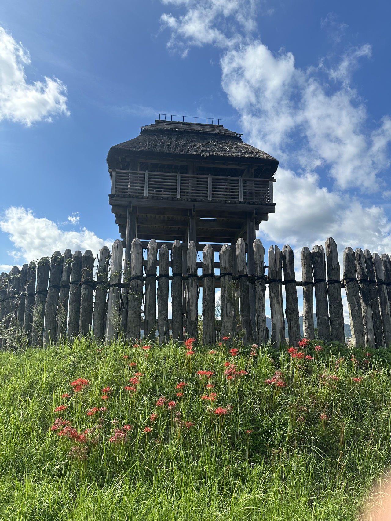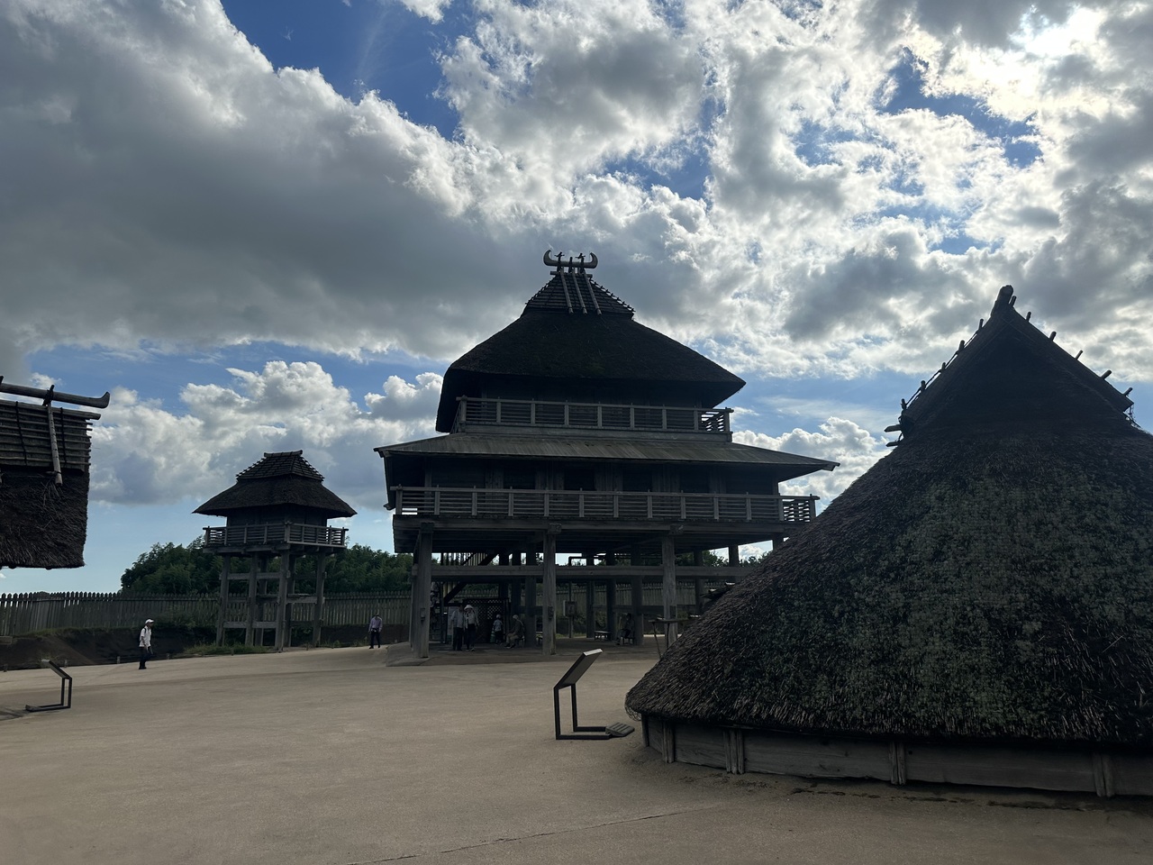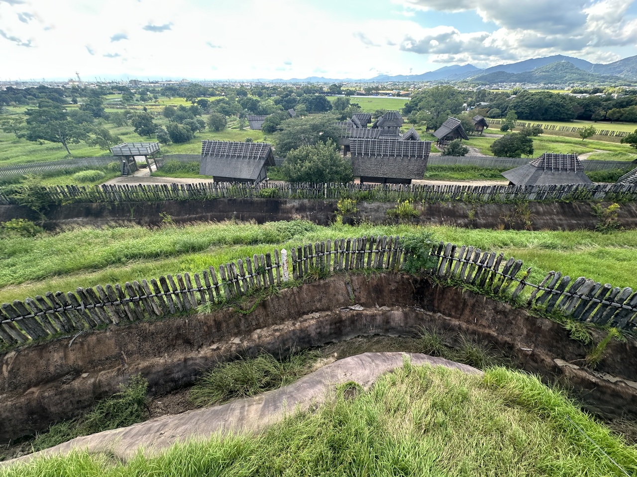 環濠集落という言葉から想像される規模を遙かに超える大規模な弥生時代の集落跡です。国営公園としてかなりの投資がされていて、建物の復元も多数。なにより掘り返された深い環濠がすごい。V字型に深く彫り込まれた壕が広大な面積をとりかこみ、柵や逆茂木(さかもぎ、敵の侵入を防ぐために、先端を尖らせた木の枝を外側に向けて並べた柵)まで復元されています。これは山城の空堀跡に興奮するお城好きなら絶対観るべき。一部壕の中まで降りられるところもあり、ちょっとぞくぞくします。さらに厳重な防御をほどこされた内郭が南北に二つ。高層の楼閣、見張り櫓など見所たくさん。櫓に登ると現代の風景は遠くにわずかに見えるくらいで古代の日本にまよいこんだような感覚が味わえます。歩くとかなりの距離ですが、南北に周回する無料のバスもあり、暑い日は冷房がありがたい。有料の区域の外側に売店、レストランもあります。
