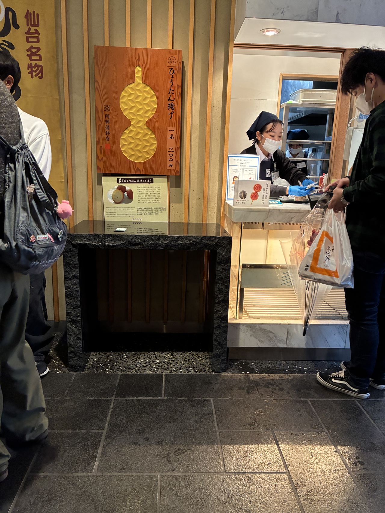 場所はクリスロードに面していてわかりやすい角にあります。お店の左側に数名座れるベンチと奥に購入レジがあります。テイクアウトで購入されてる方も多かったです。ひょうたん揚げは蒲鉾版アメリカンドッグで300円。