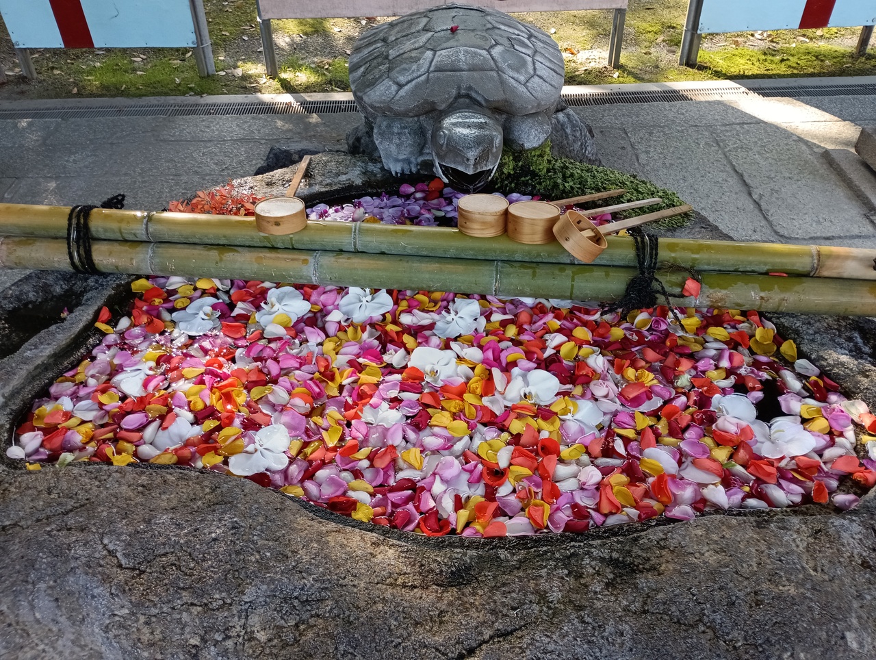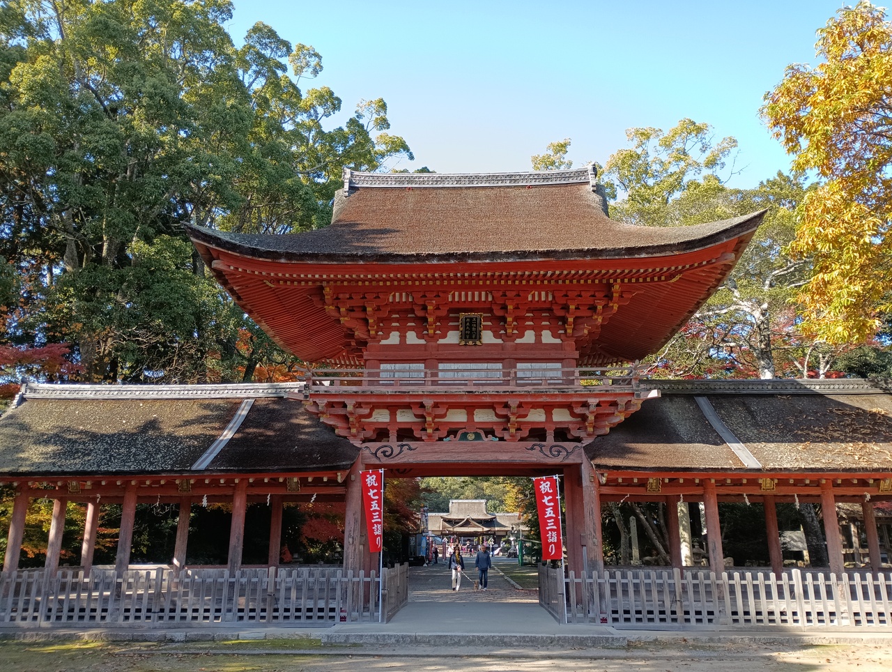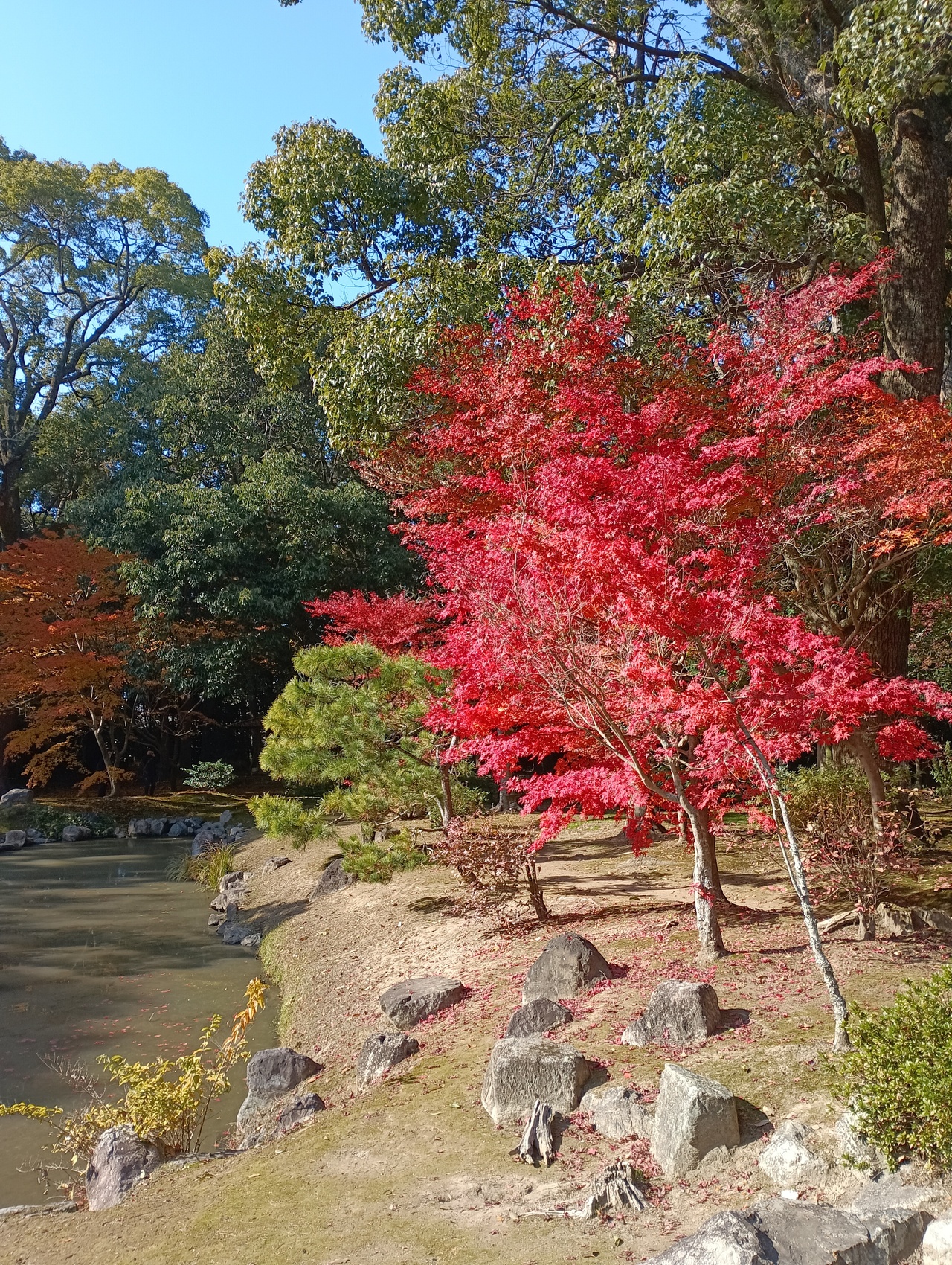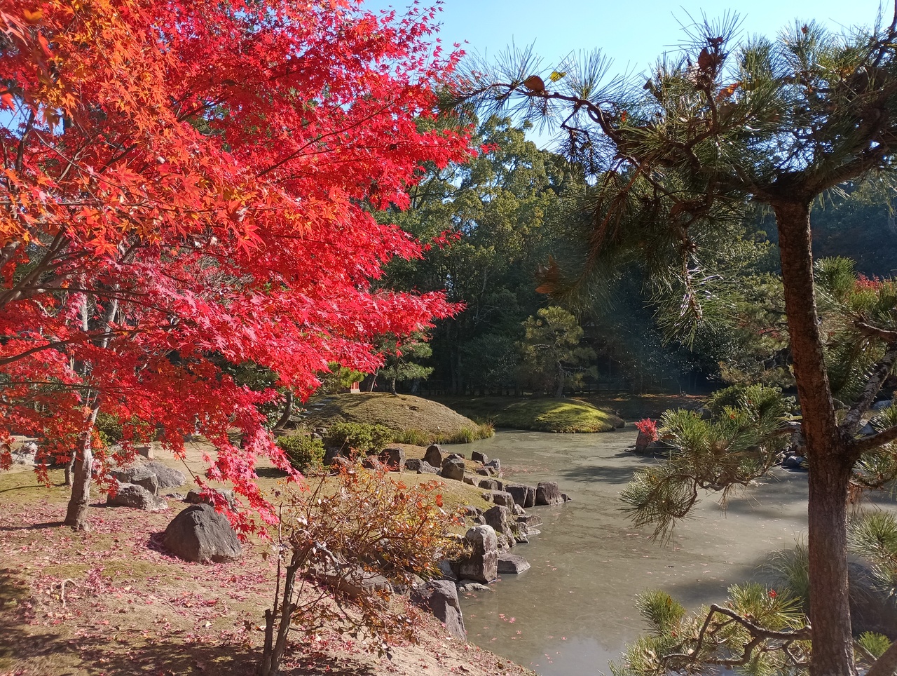 NHKで「2025年の11月中は、庭園拝観は無料」と放送していたので最終の30日に訪れた。庭園は普段200円の拝観料がいる。ただし無料期間でも、5名以上の団体は有料の場合があるそうなので、事前に問い合わせた方が無難。ちょうど「紅葉の琵琶湖と兵主の四季と食」のイベントも開催されていた。庭園の紅葉は見事だった。池は水面にいろんな物が浮いていて、周りの景色を映すこともなく残念だった。