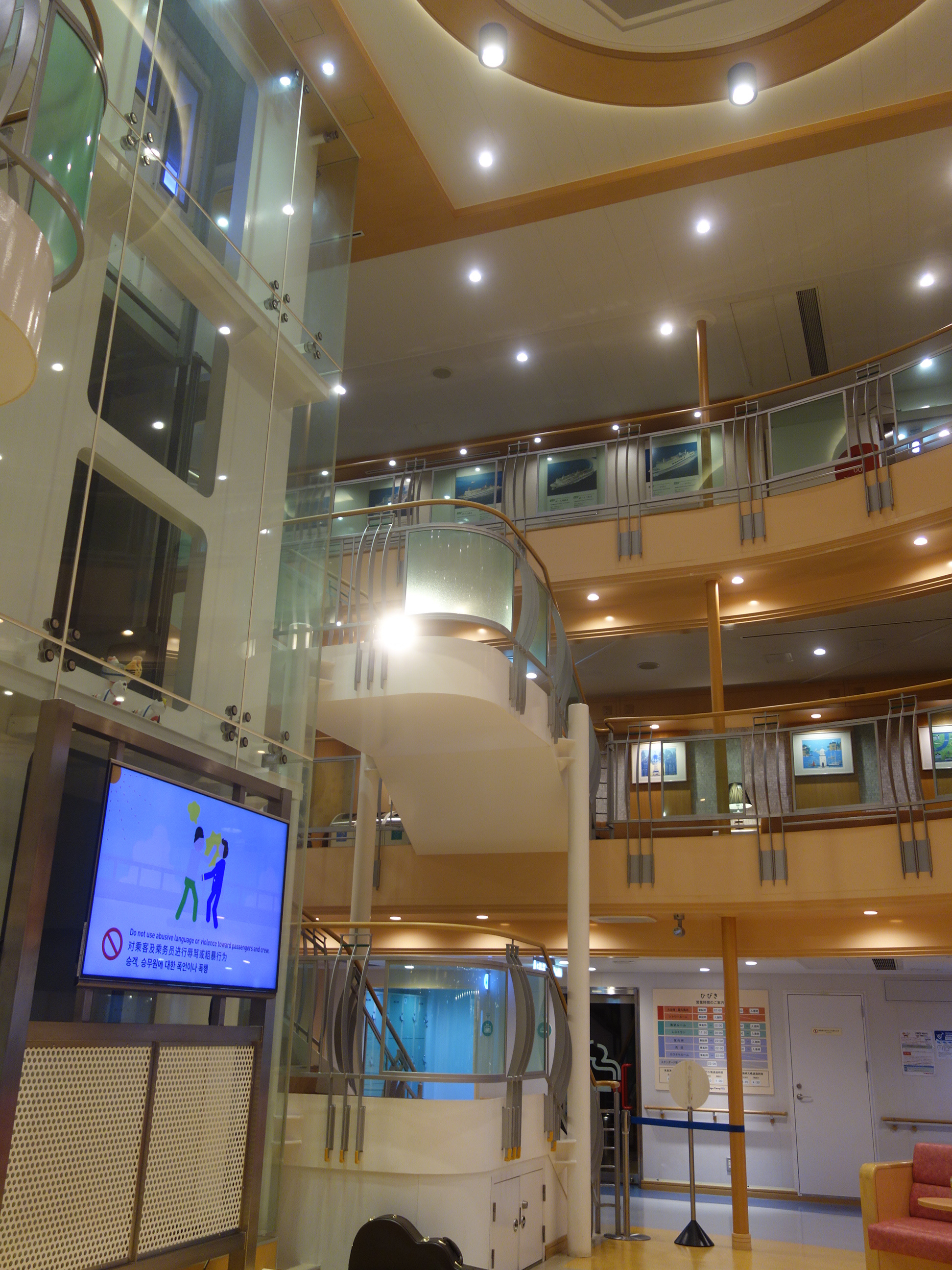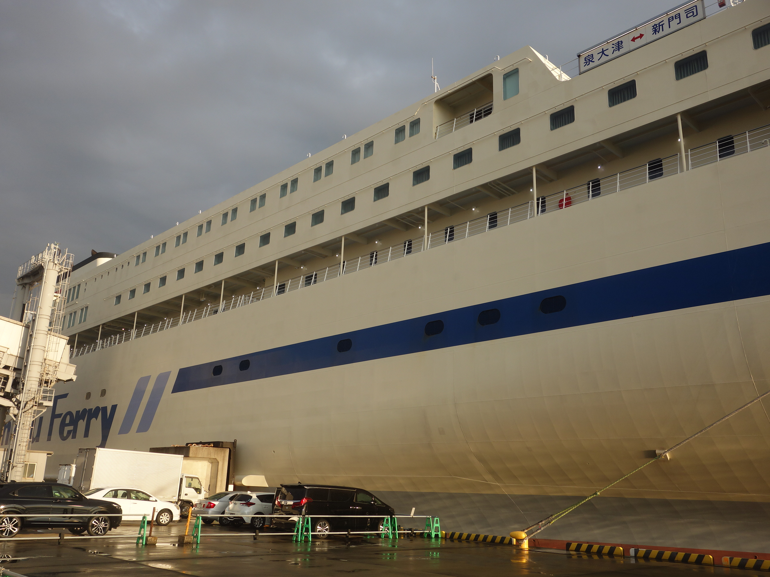 泉大津から新門司へのフェリーです。(神戸からもあります)客室の数も多くて、豪華客船に乗った気分が味わえます。ただし、豪華なエンターテインメントもないし、免税店もありません。食堂がありますが、高級レストランはありません。大浴場があります。人気です。寝巻はおいてありますが、バスタオルはおいてありません。冷蔵庫もありません。電気ポットはあります。インターネットは1日30分だけつながります。費用対効果を考えると、お得な旅行となりとおもいます。オススメです。