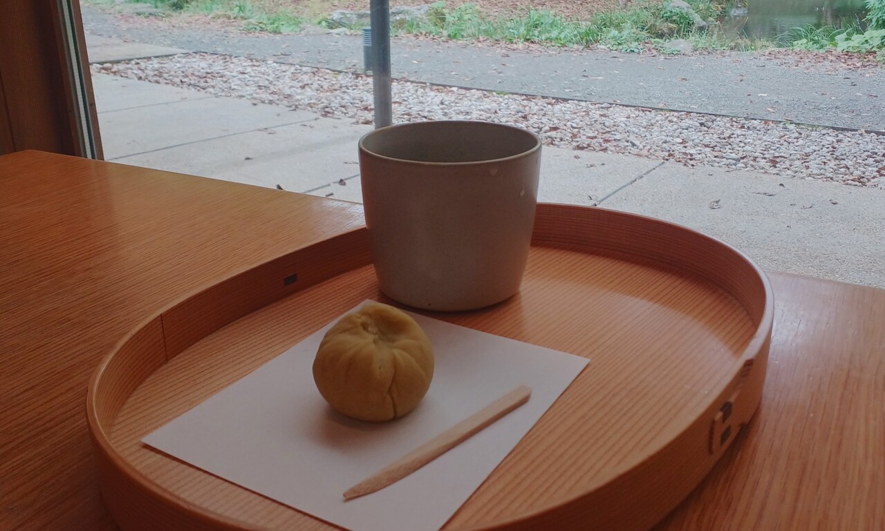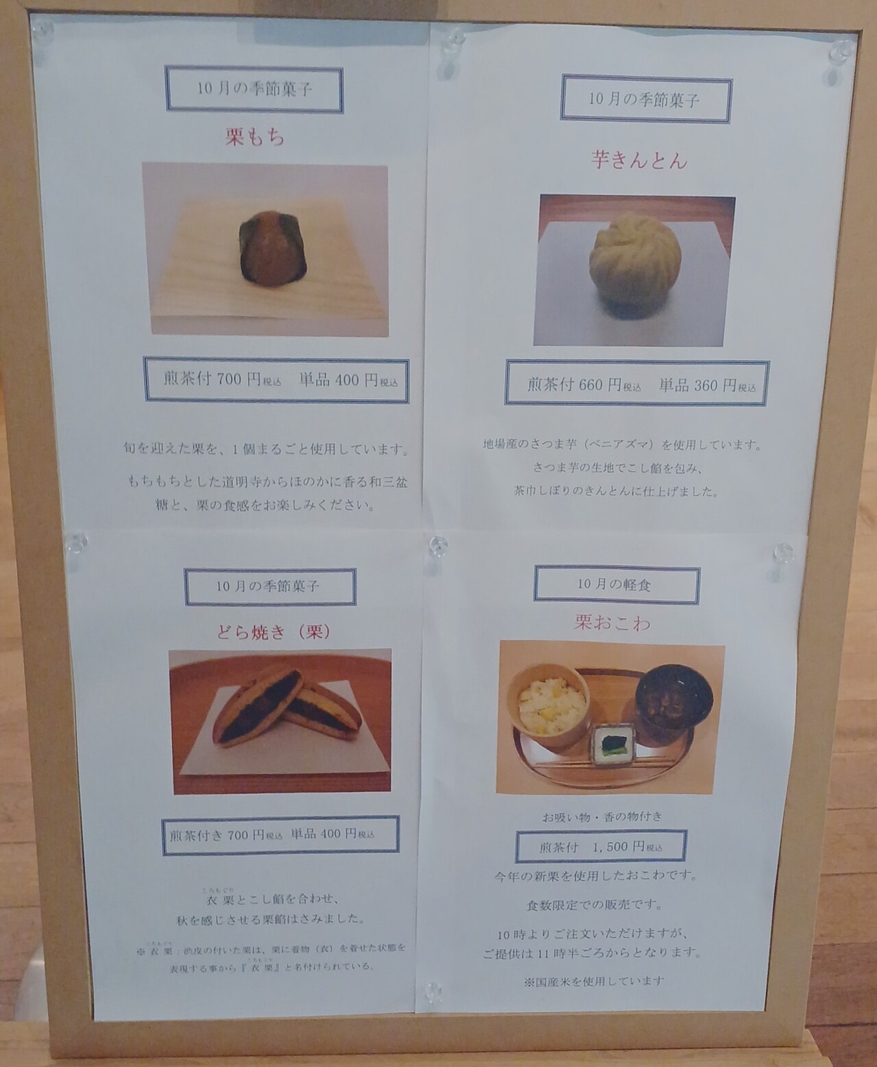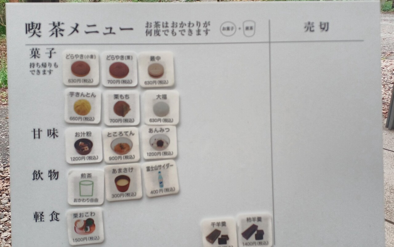 10時オープン。平日の9:55頃に着いたら1番客だった。誰もいな店内も撮影出来た。2025年10月の季節菓子は栗持ち、芋きんとん、どら焼き(栗)。軽食は栗おこわ。お茶のおかわりは無料なので、大人がゆっくり和菓子を頂ける。御殿場にはとらや工房へ寄るために行くようなもの。