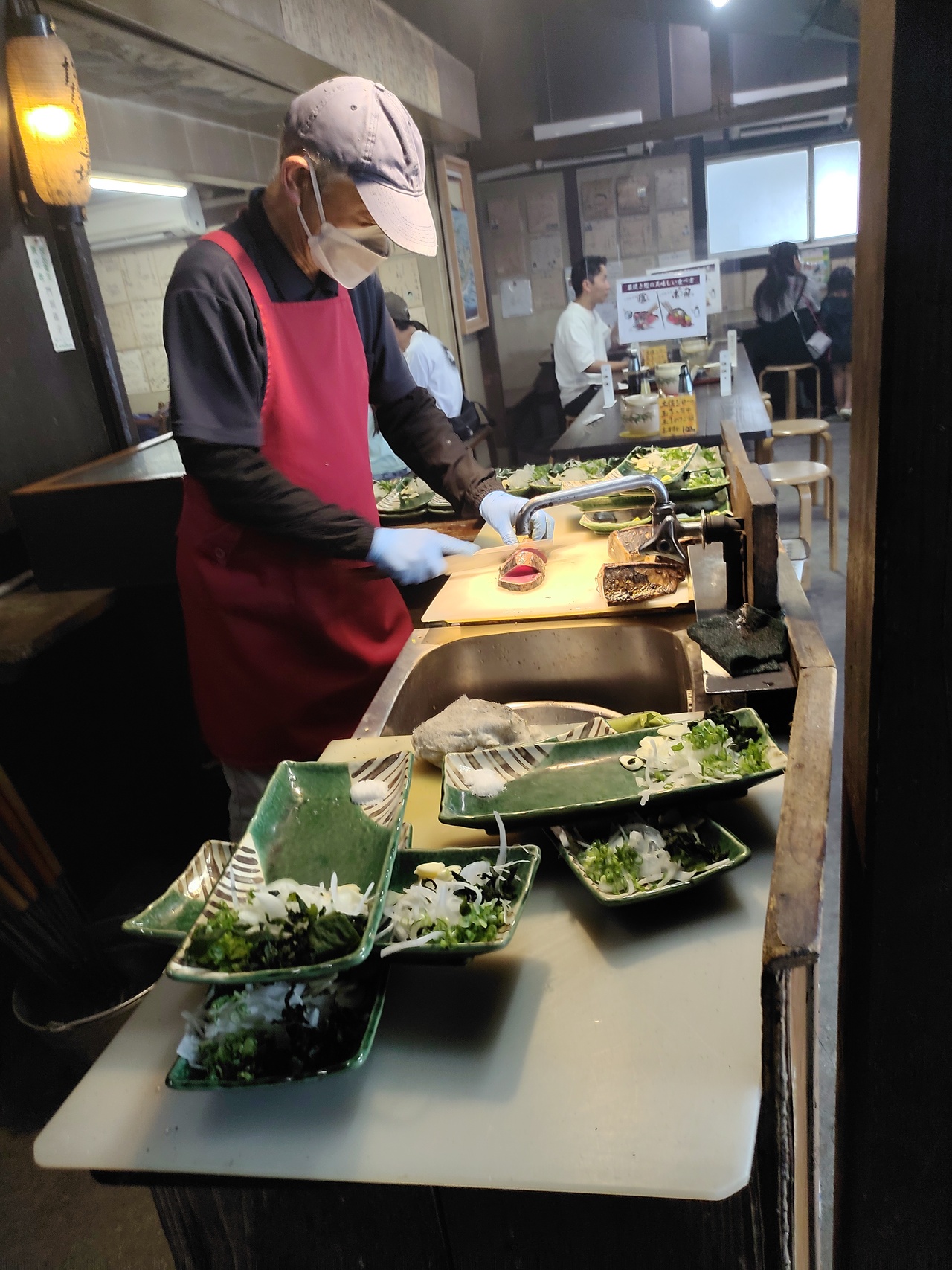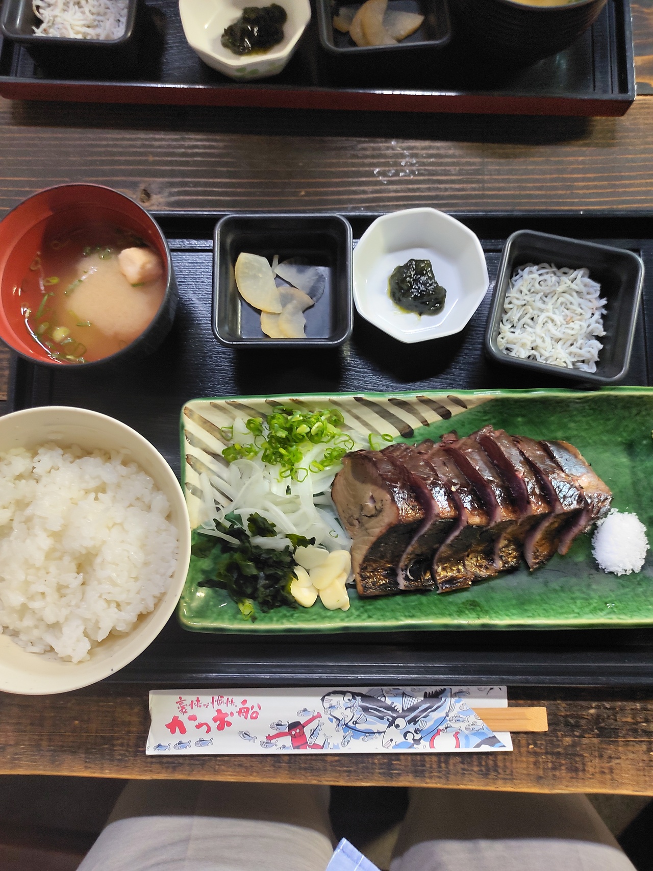 団体客が帰ったところで、すぐに入れました。まず「カツオのたたき」のみか「ご飯、みそ汁付の定食」かを聞かれます。