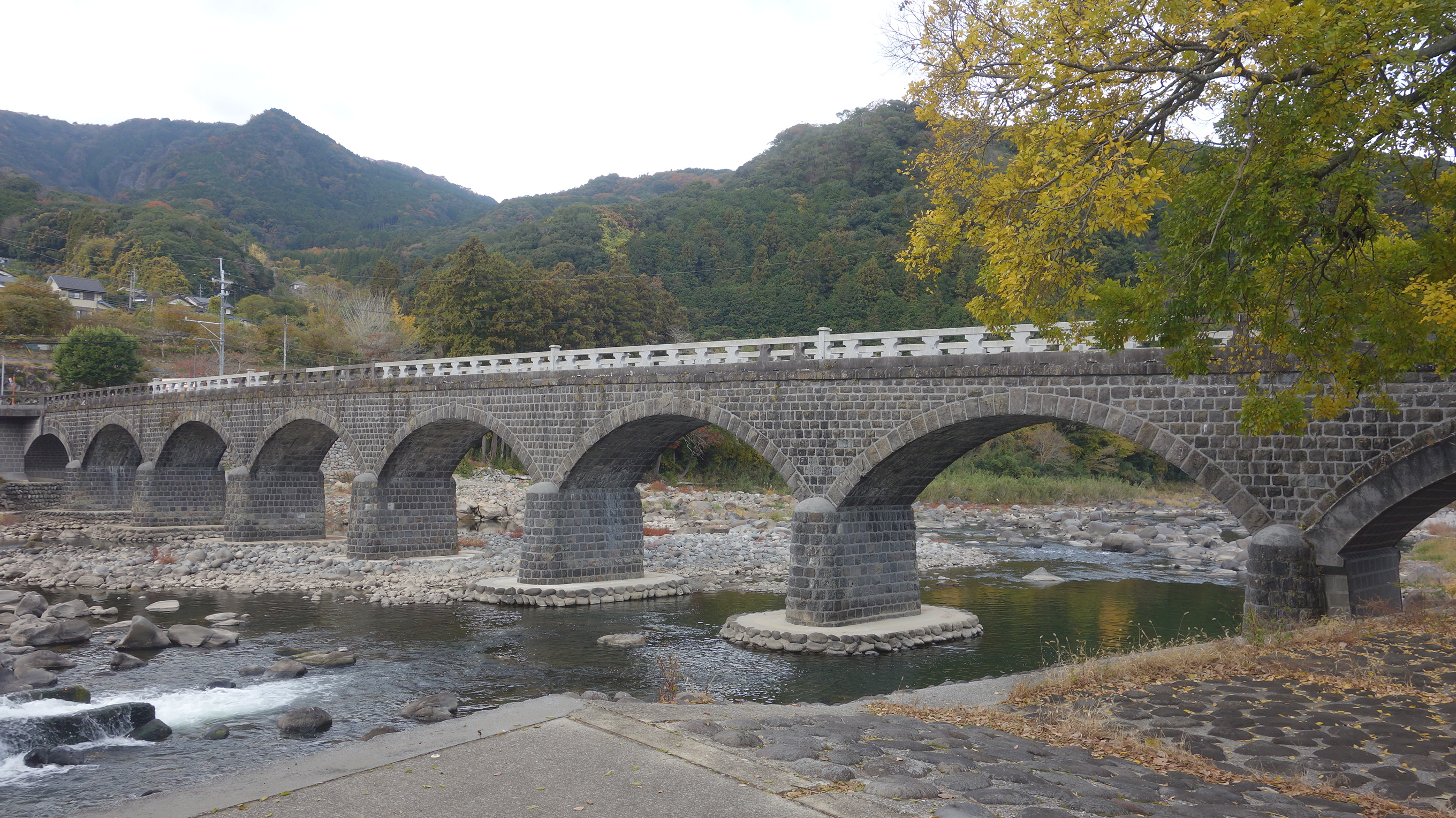この辺りは川幅が広いのではしも長くなります。長崎の眼鏡橋を想像していたのですが、それより、ずっとながい。頑丈そうにできています。大正時代の建造だそうです。このあたりで必見の土木遺産です。特に、橋ファンには欠かせません。
