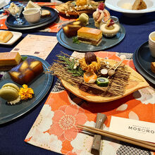 [*セイボリー] ・菊花手毬寿司 ・柿サーモン ・いが栗 ・キスの射込みきゅうり ・むかご串 ・シェパーズパイ ・3種のキノコのブイヨンスープ ・サーモンときゅうりのサンドウィッチ ・さつまいもとりんごのゴルゴンゾーラサラダ