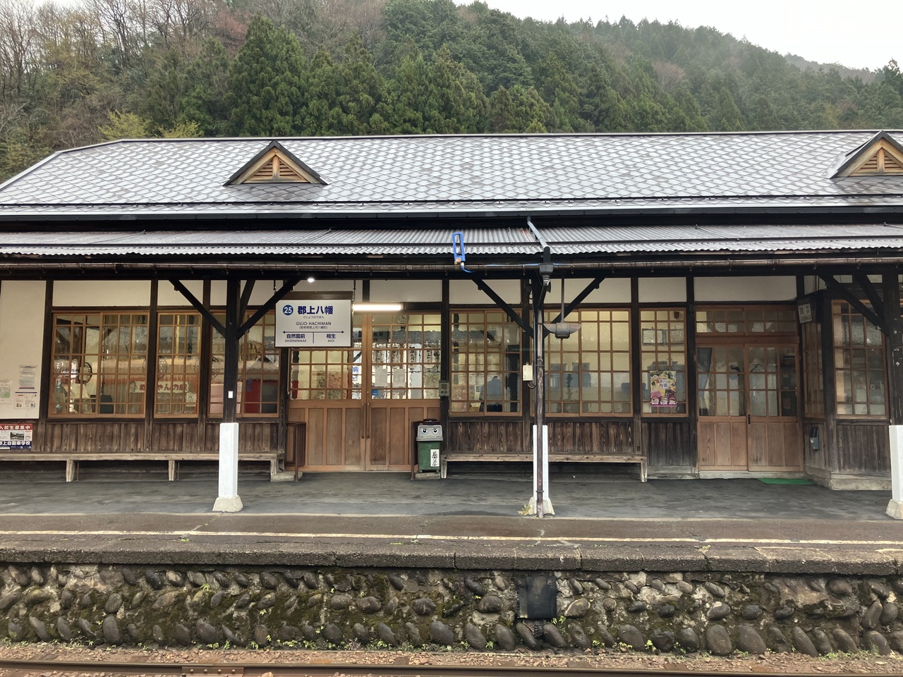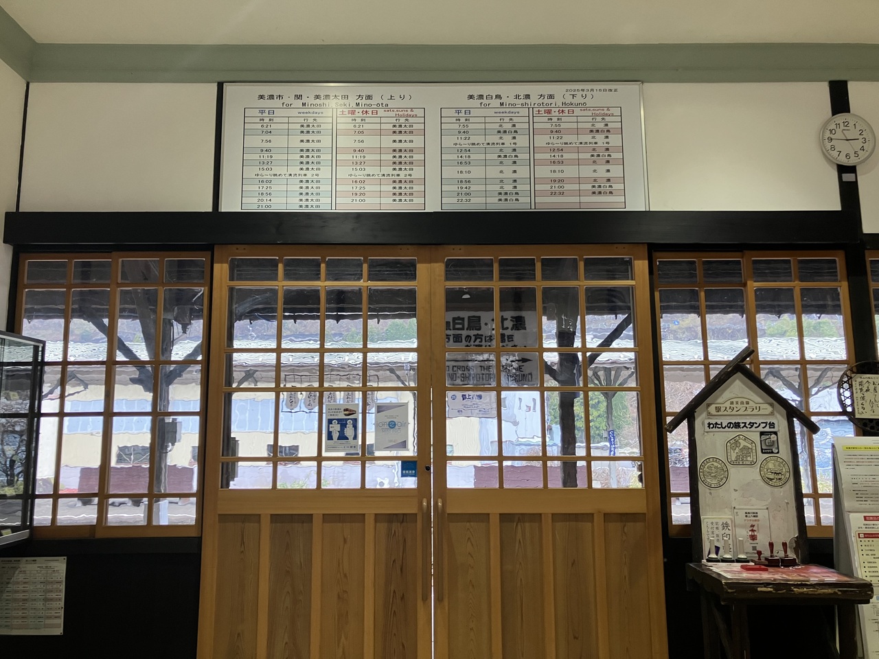 長良川鉄道の中心駅。木造の駅舎はリニューアルされていますが、1929年の越美南線開業時から使用しているもので、2017年に開業時の外観に復元されているとのこと。駅構内には観光案内所やカフェ、売店があり、列車を待つ時間にも利用可能。本屋やプラットホーム、跨線橋などは2015年の国の登録有形文化財として登録されています。