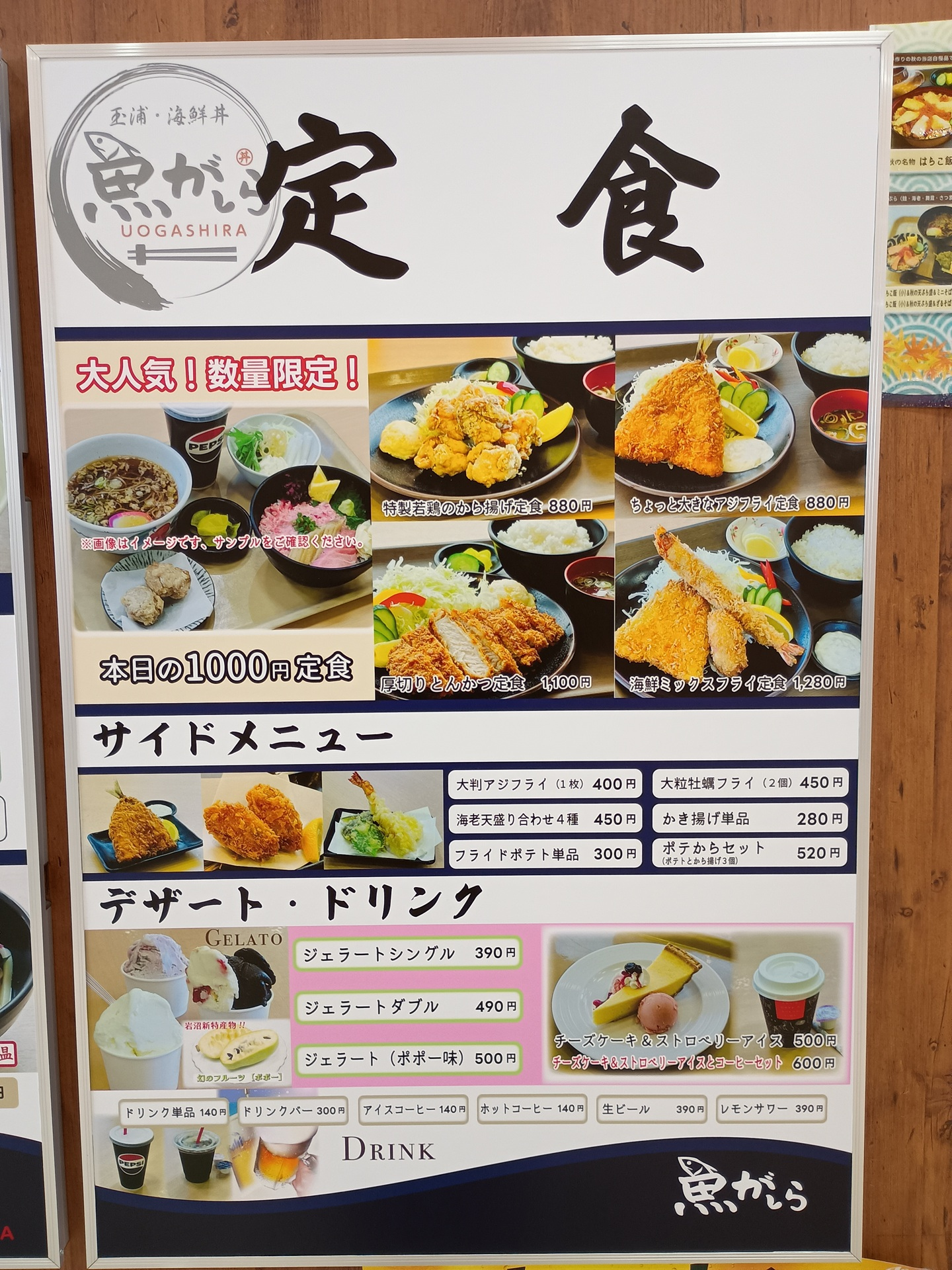 仙台空港にある食品スーパー(ドラッグストアも付随している)の一画にあるフードコート。複数店舗では無く1店舗だけで営業しているスタイルだ。メインのメニューは海鮮物で海鮮丼が名物のよう。他にもフライ物、天ぷらも海鮮物が具になっているものが多い。他にはラーメンやそば、うどん、カレーライスなどもありオールマイティな品揃えだ。
